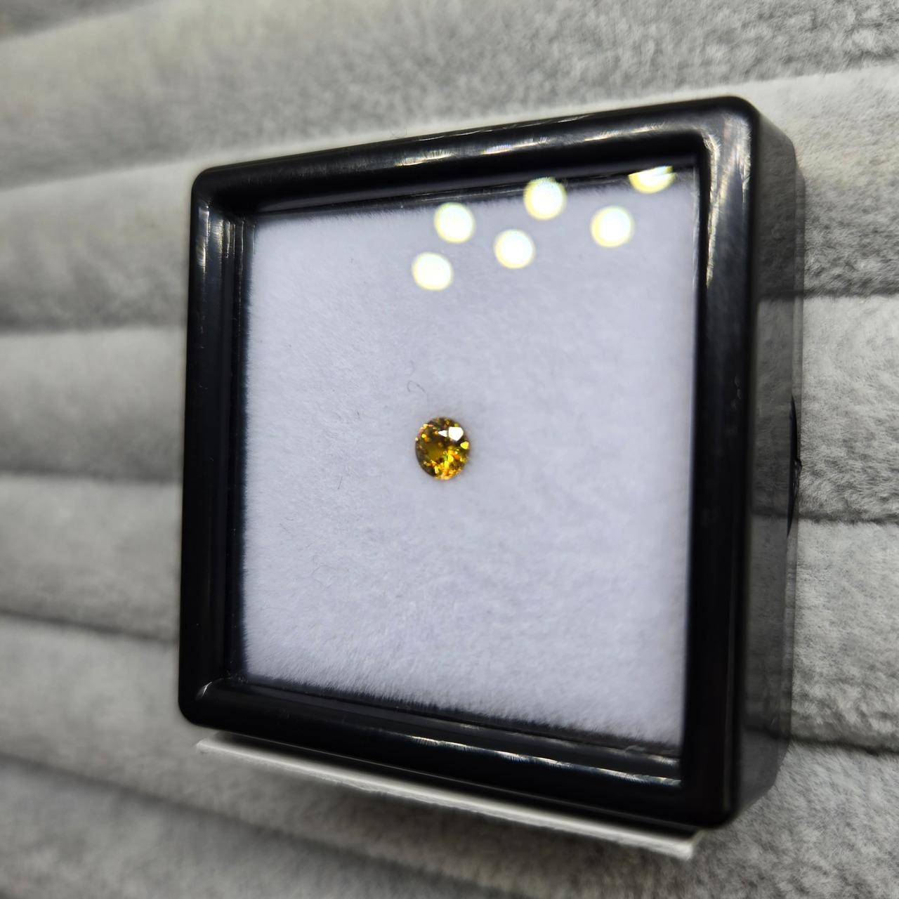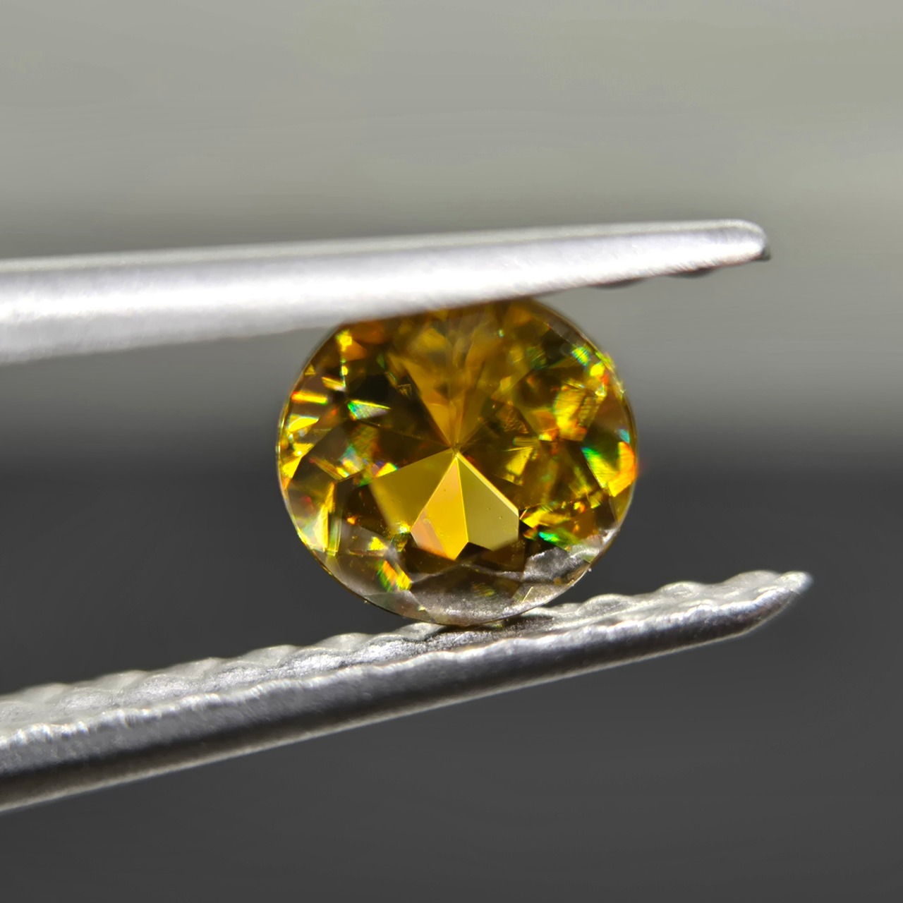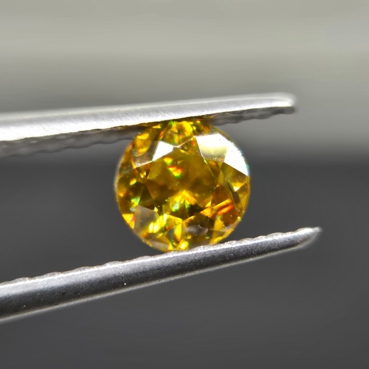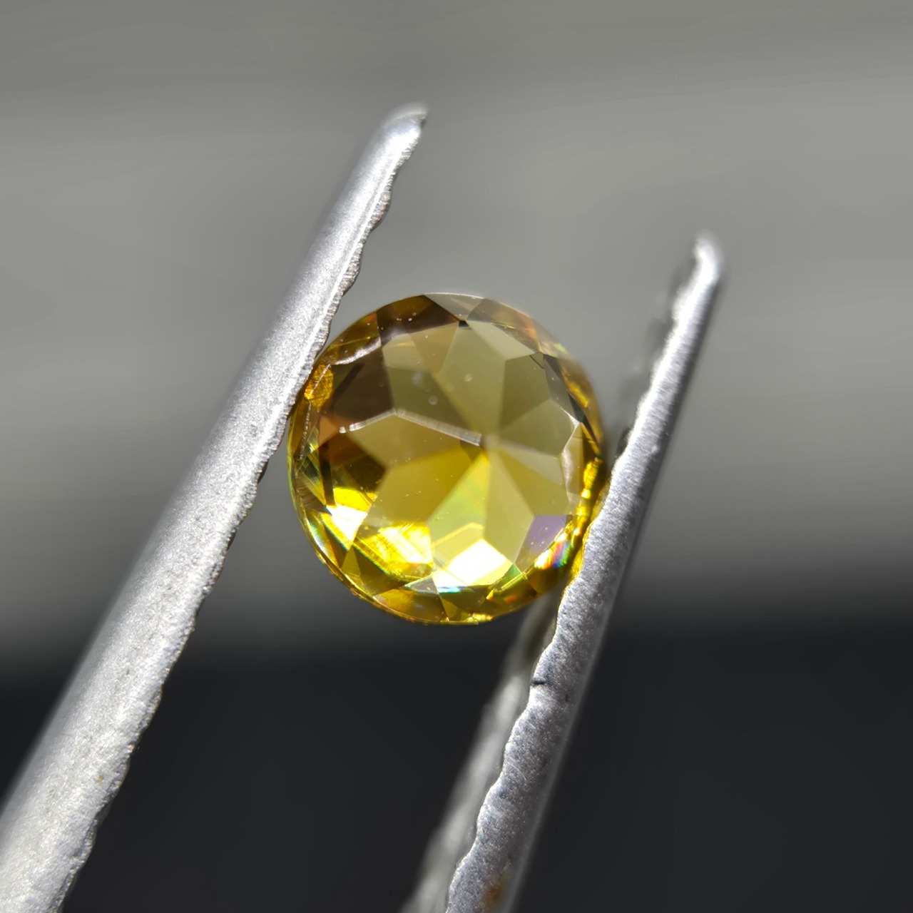 光を当てることで、黄色い地色に、赤や緑などの輝きが反射して見えます。