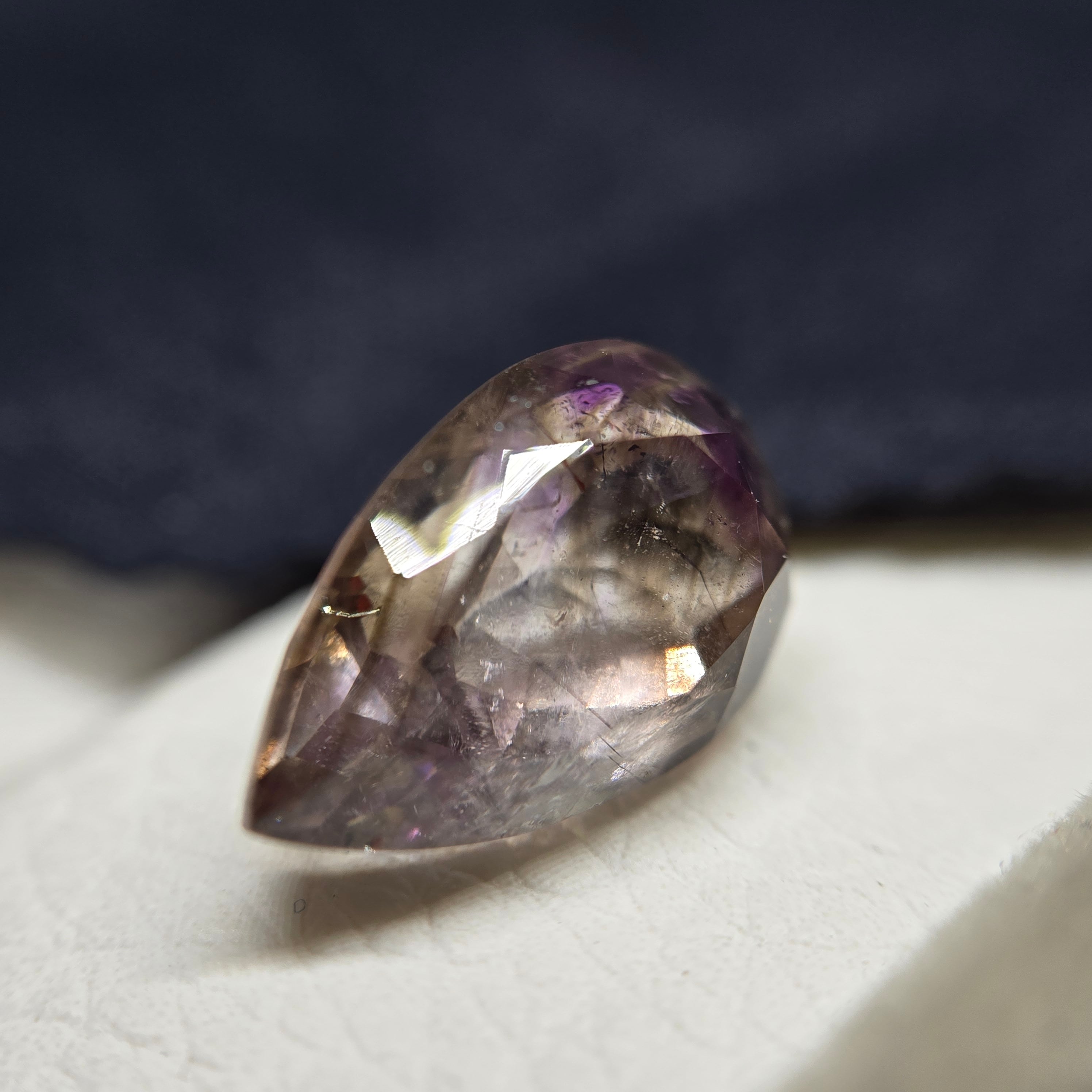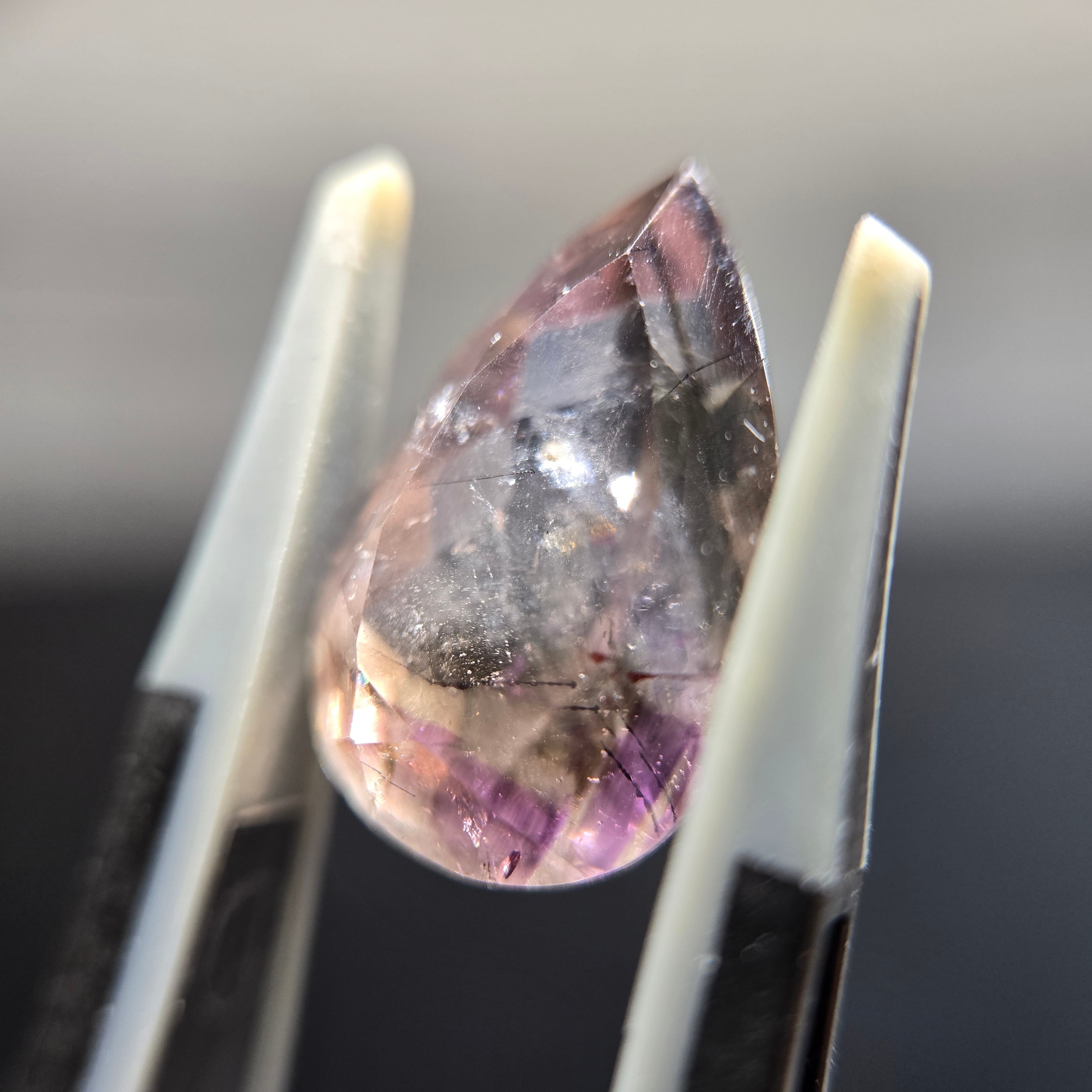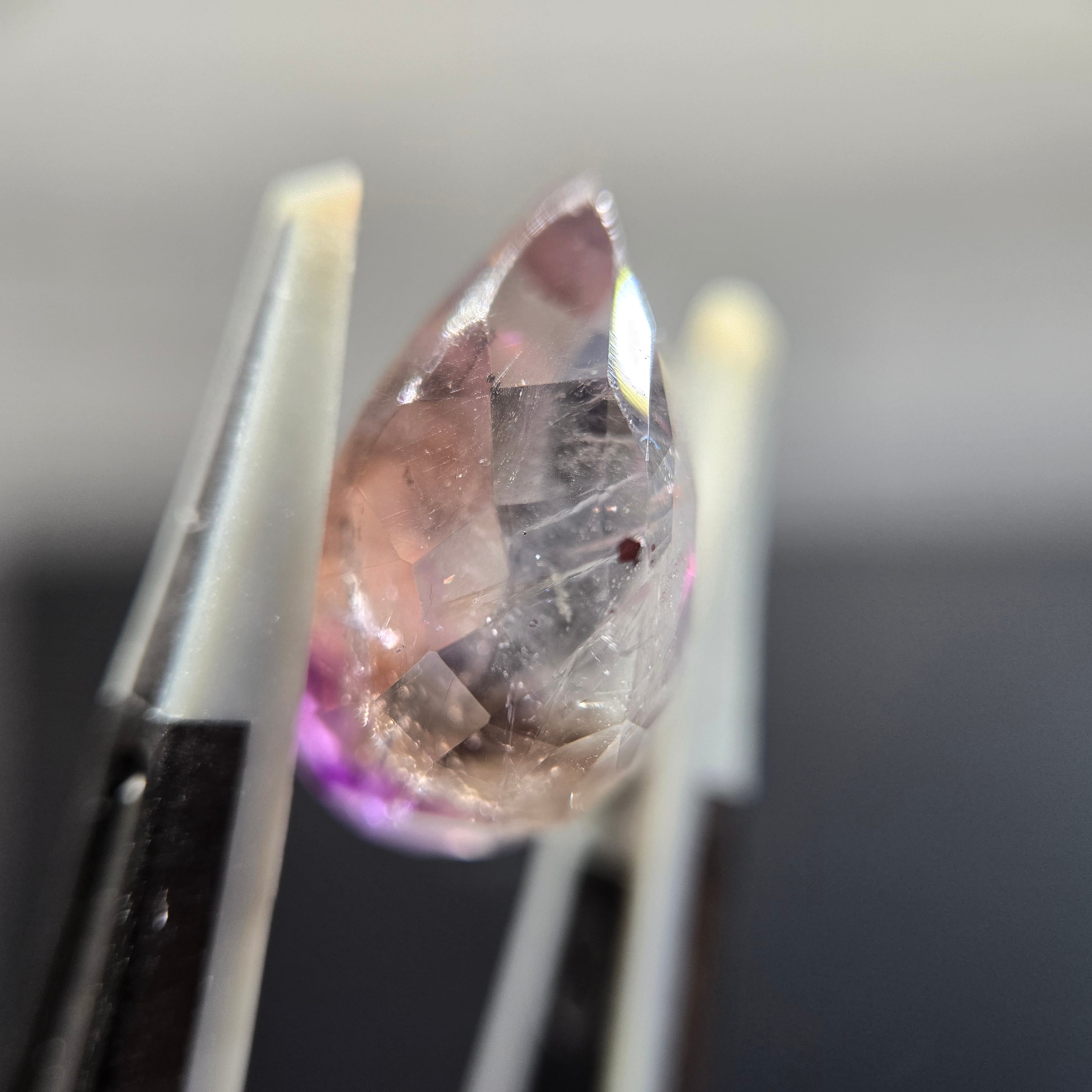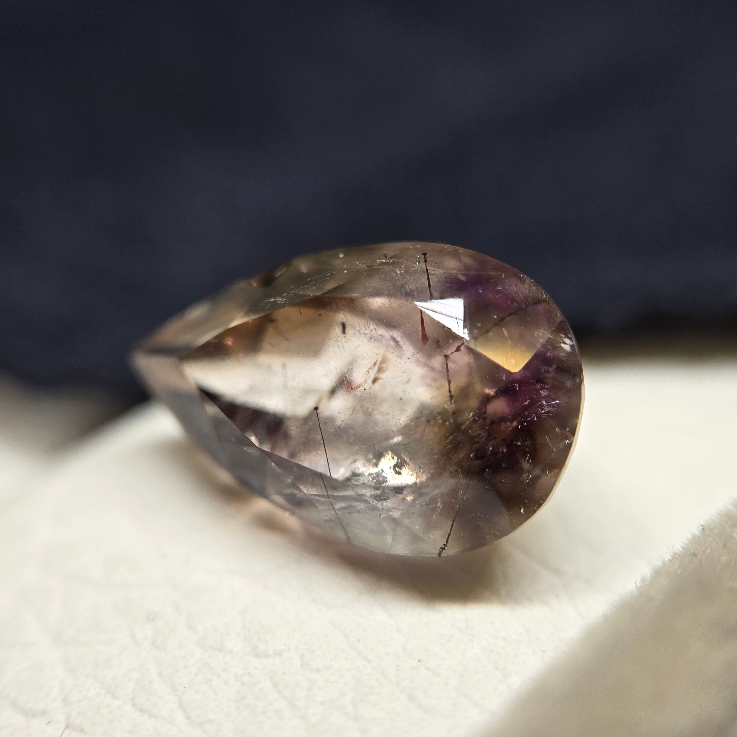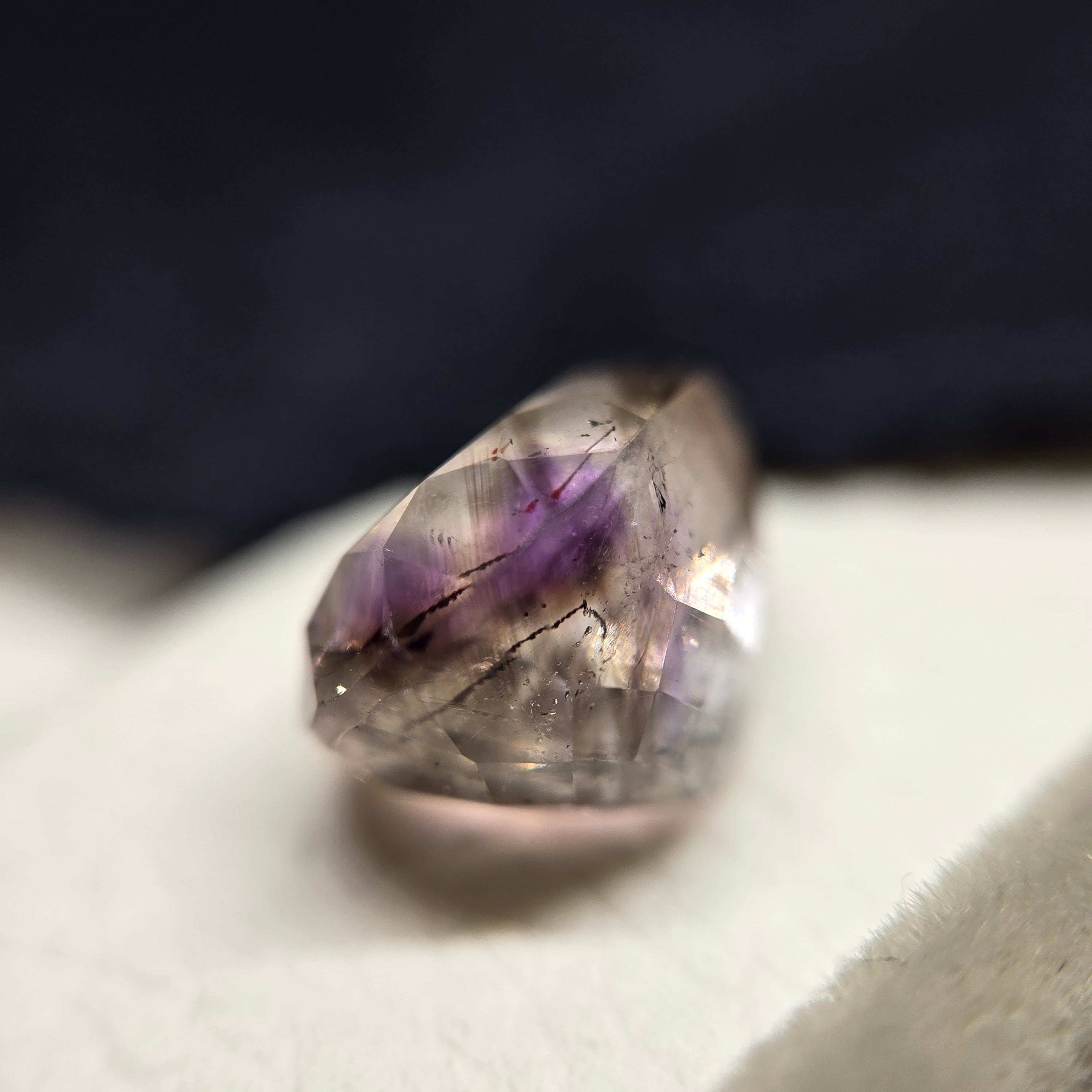 ・内包物としてはレピドロクロサイト、針状のインクルージョン少し見え、光を当てることでクラック等による複雑な煌めきを呈します。