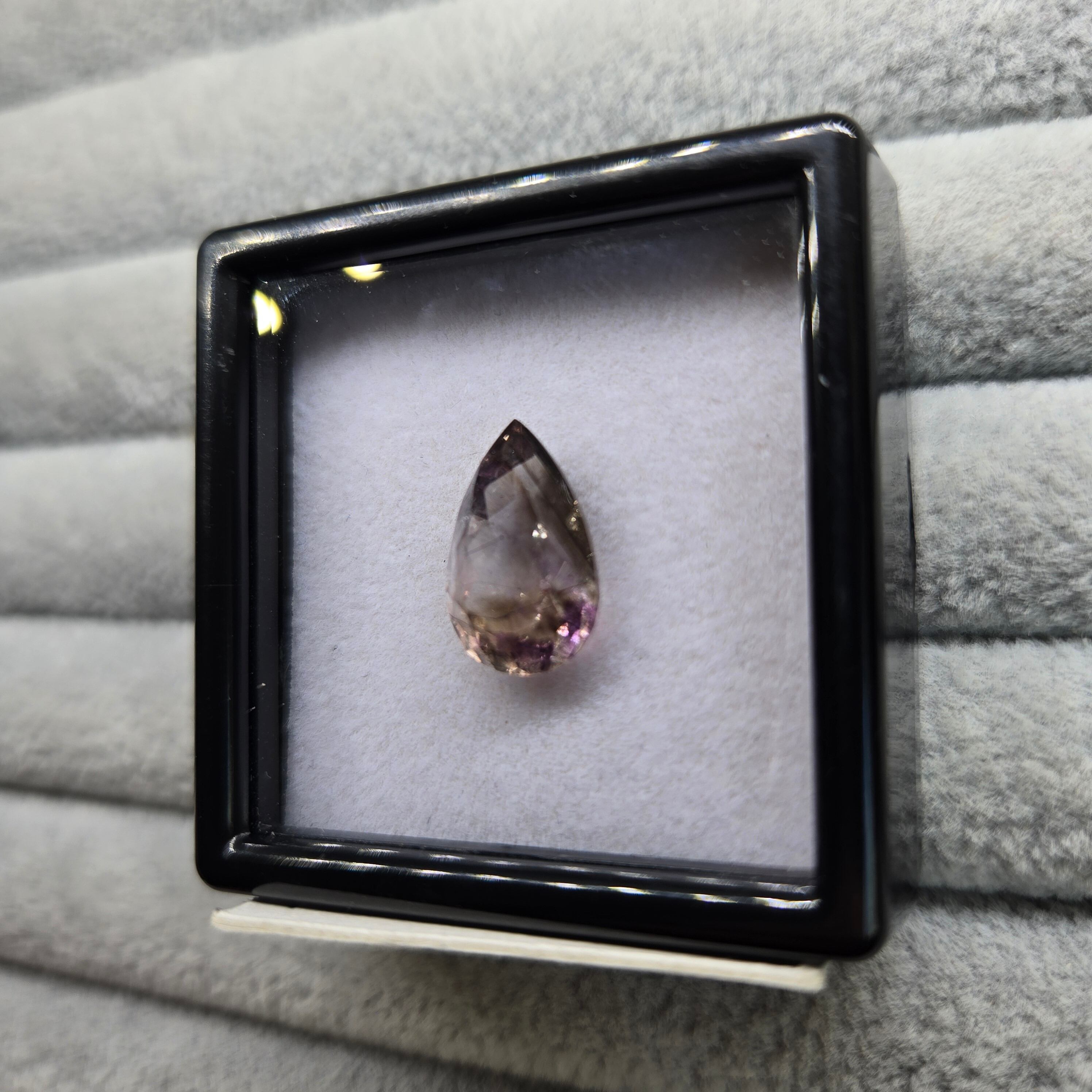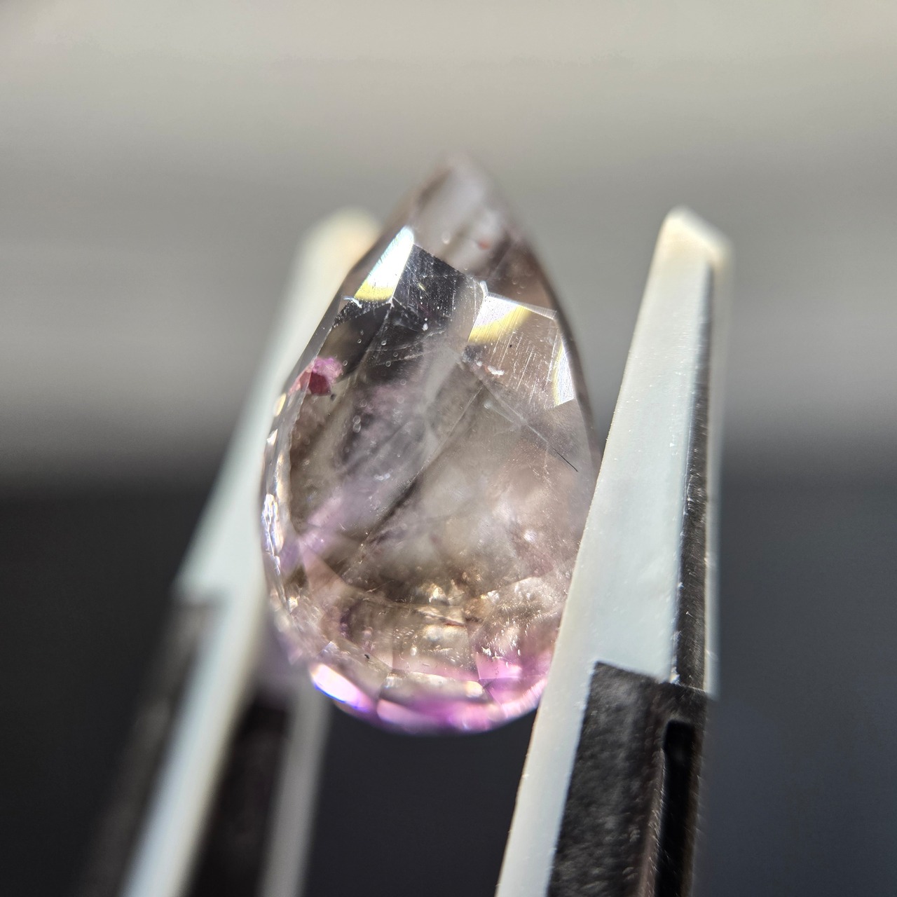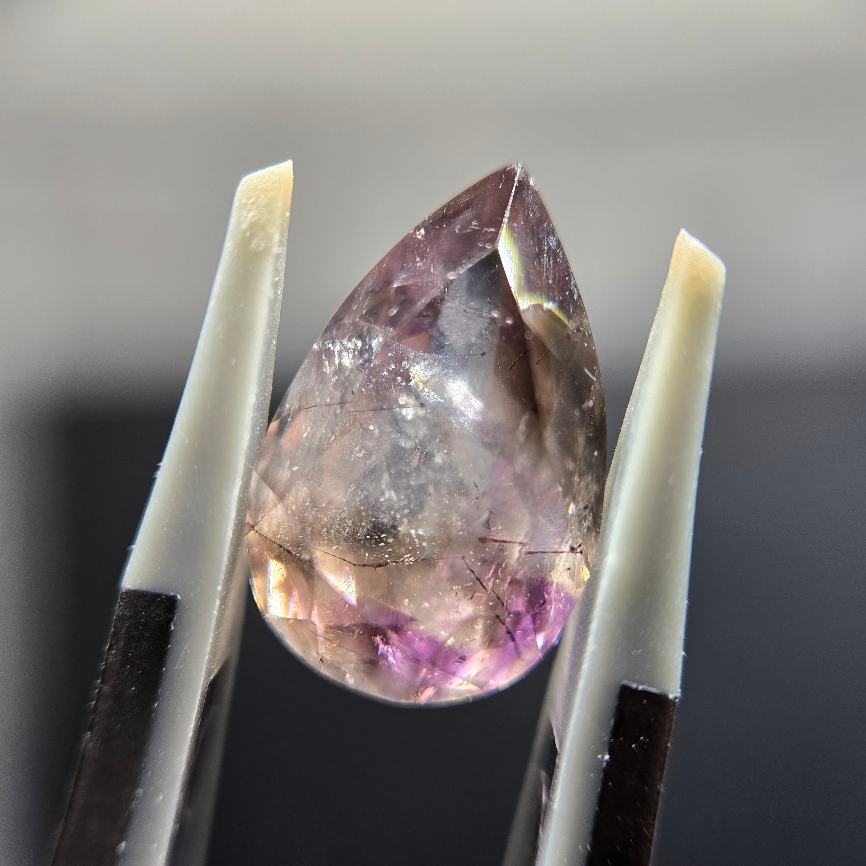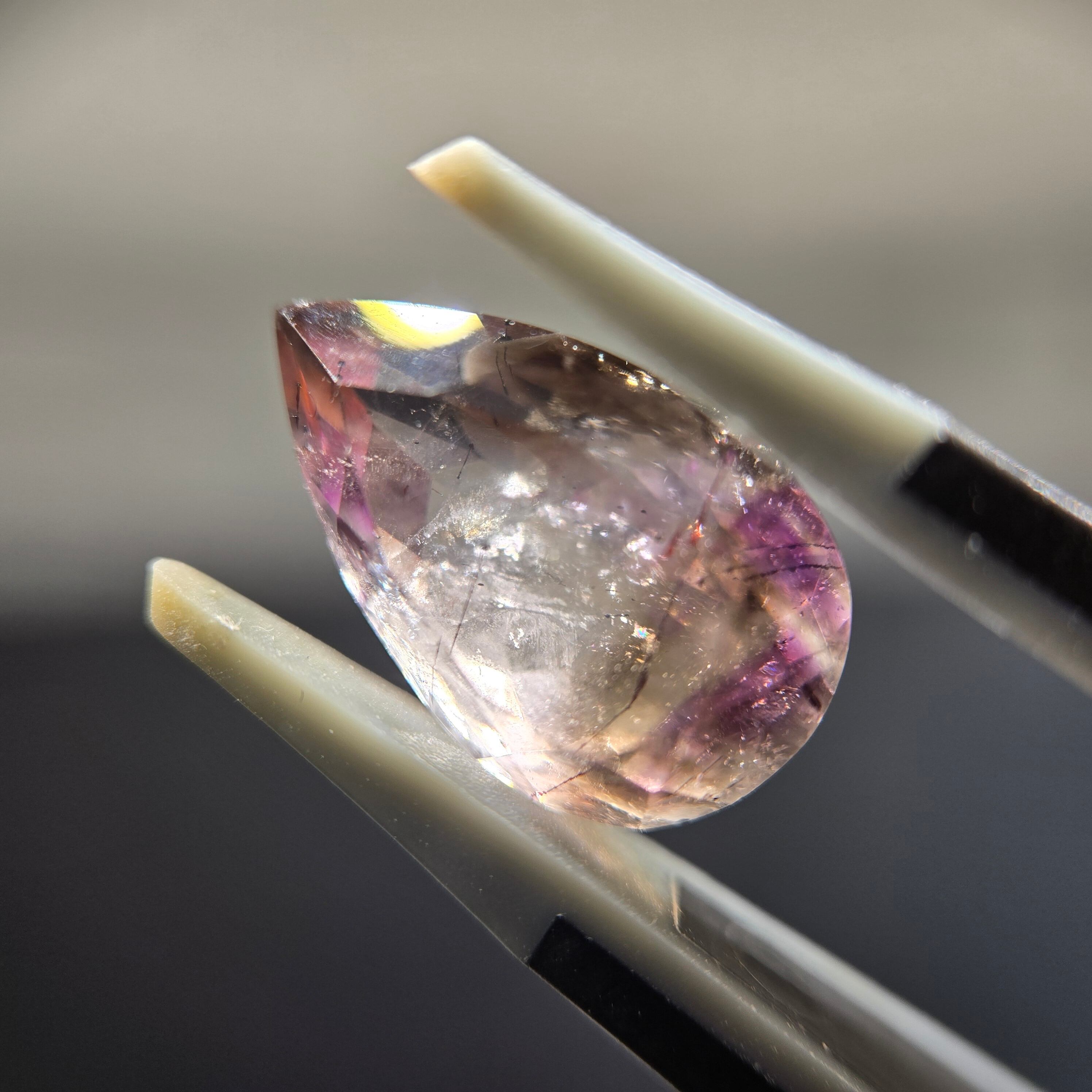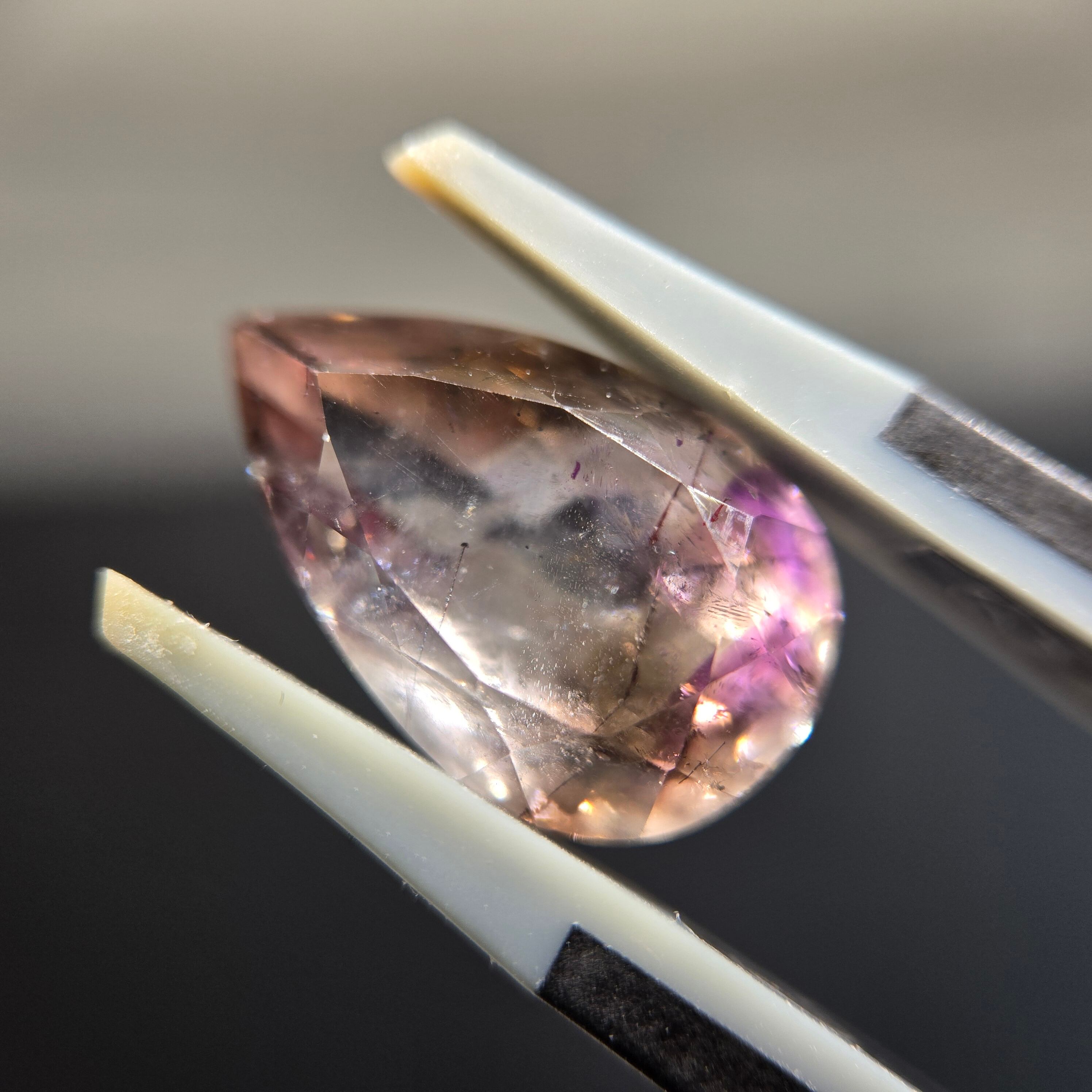・内包物としてはレピドロクロサイト、針状のインクルージョン少し見え、光を当てることでクラック等による複雑な煌めきを呈します。