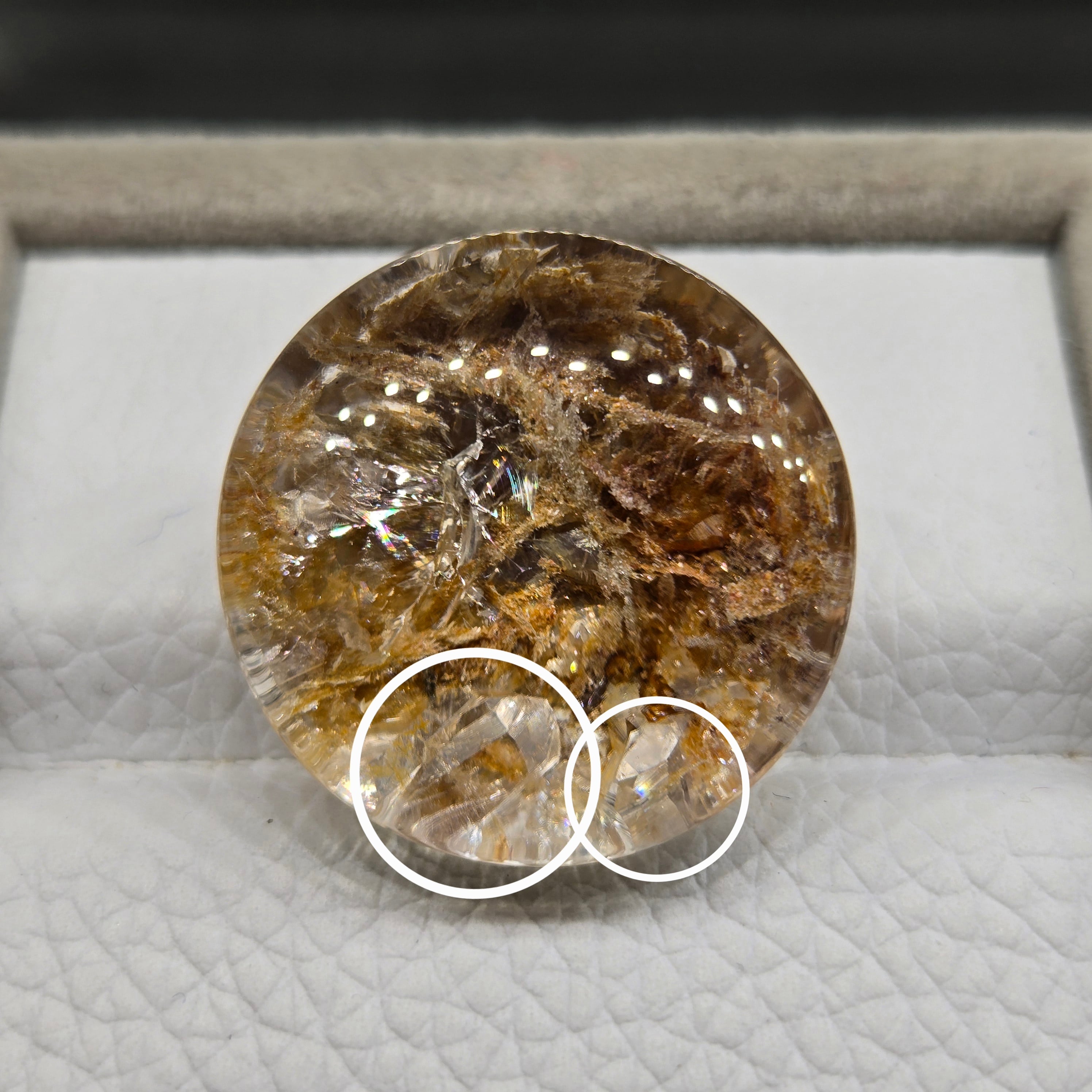 ・この石の特徴は、写真一枚目に○印(2ヵ所)の場所にクォーツの小さな結晶がございます。内包物とのコントラストの関係で少し区別しにくいですが、よく見ると結晶の終端を見ることもできます。