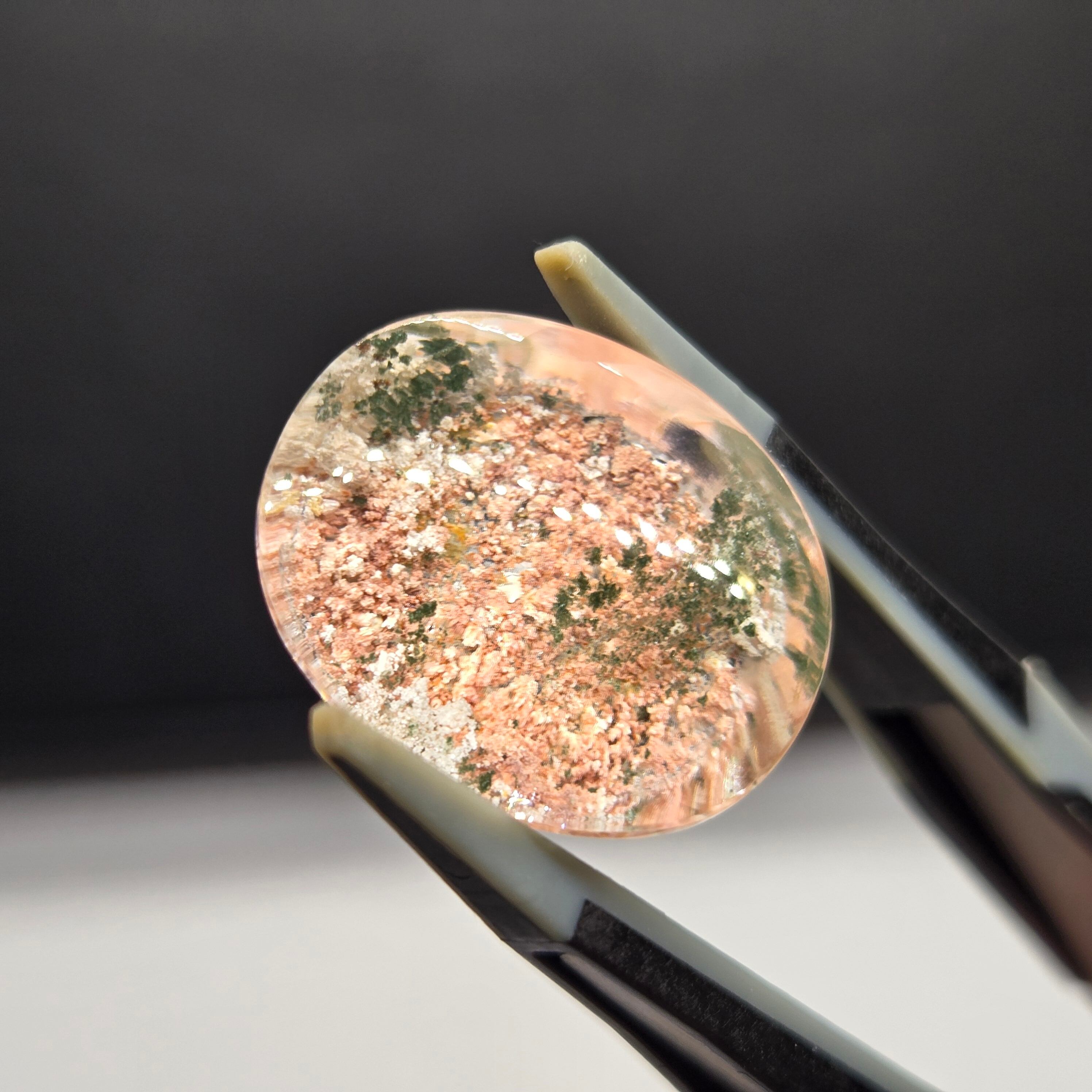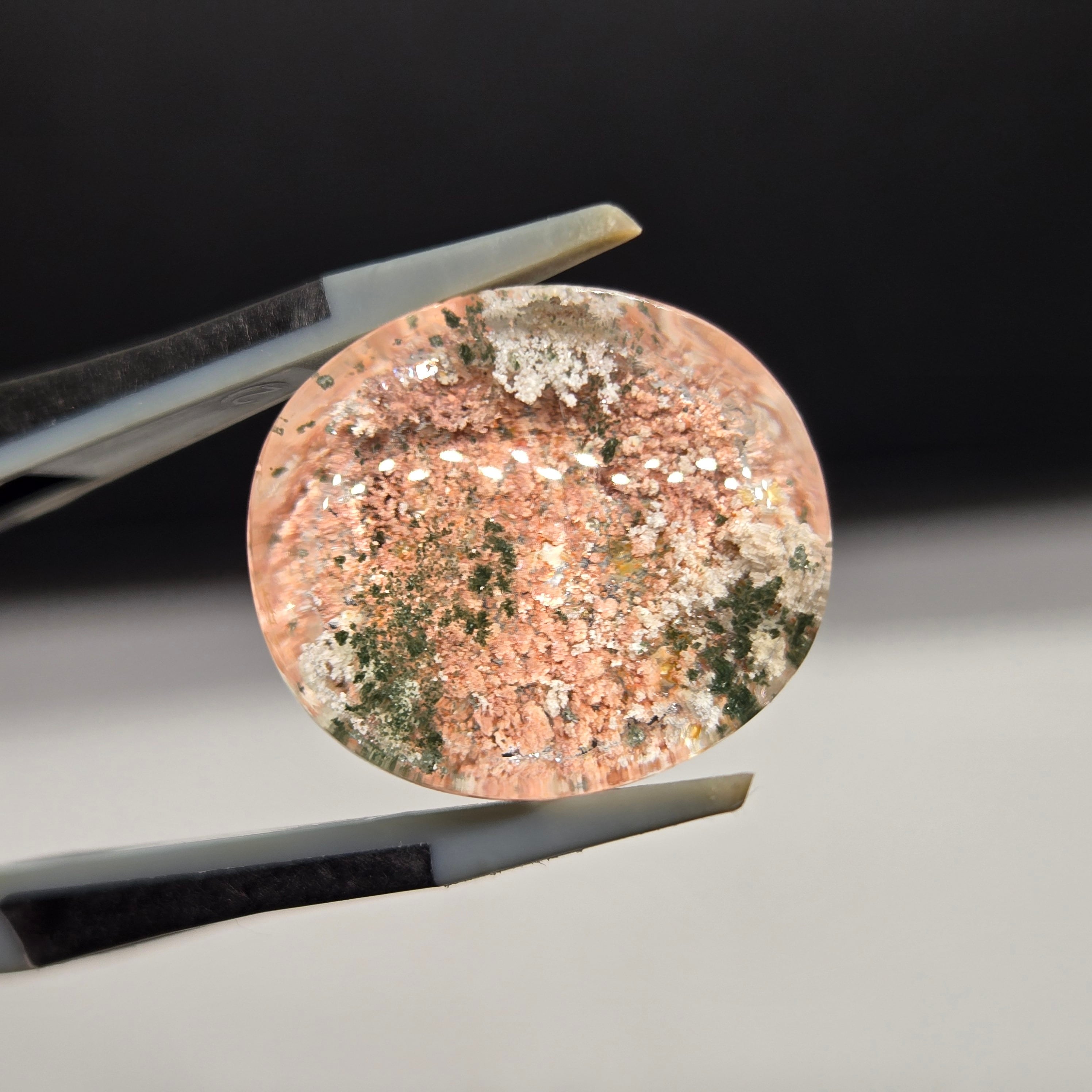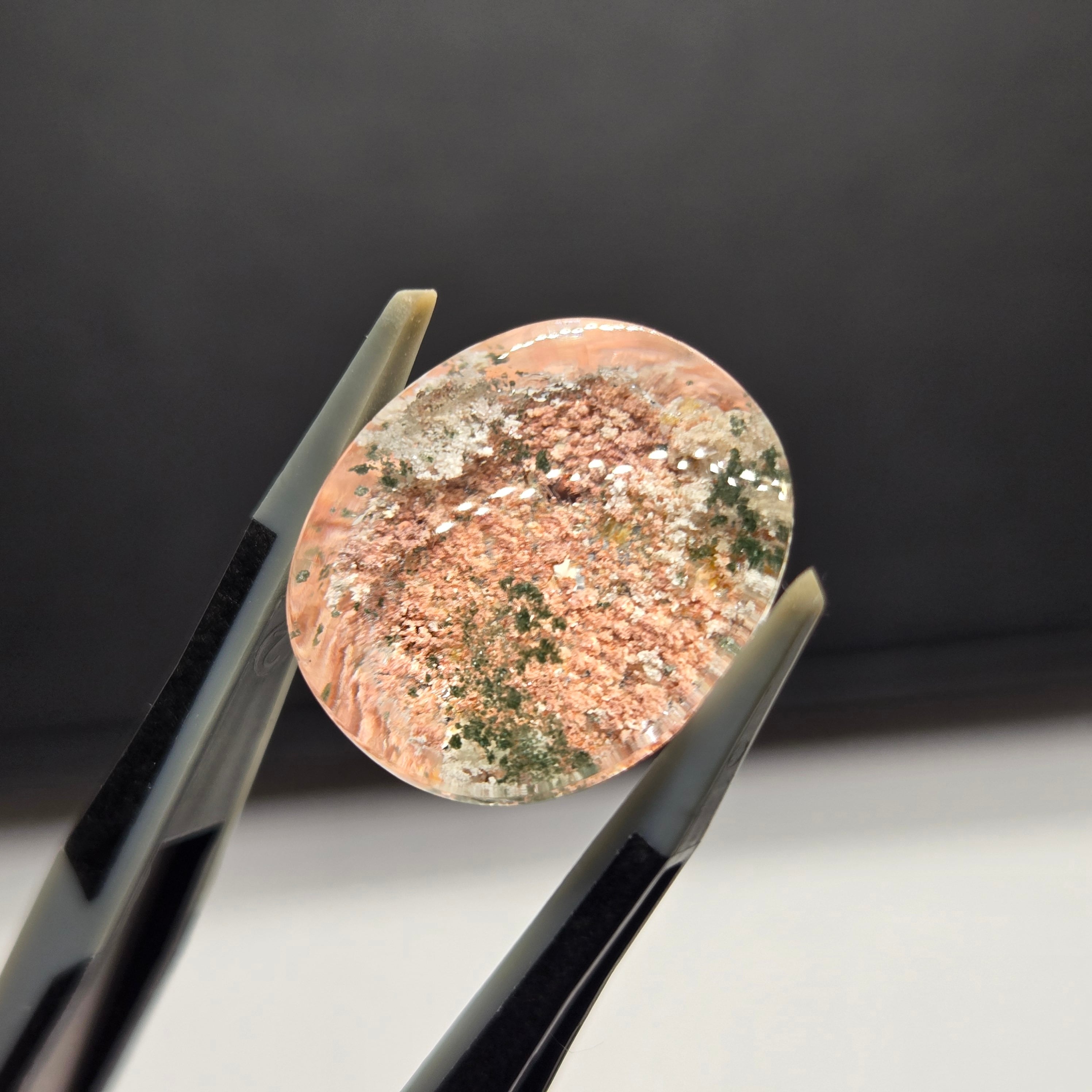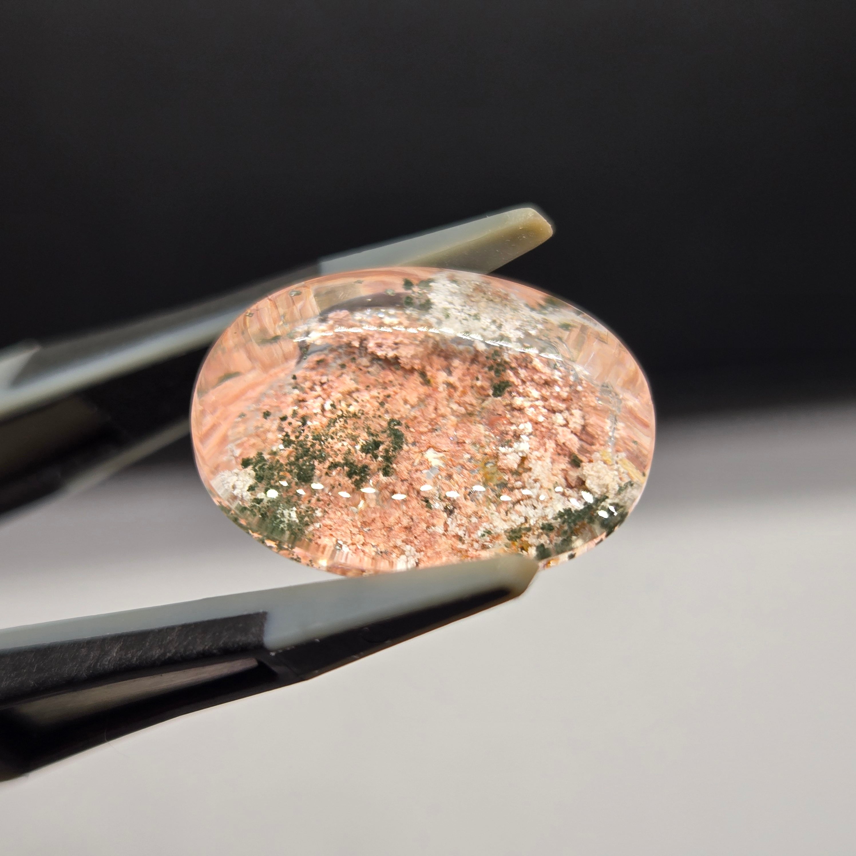 ・サーモンピンクに近い色を基調に、乳白色や緑色の内包物が見えます。