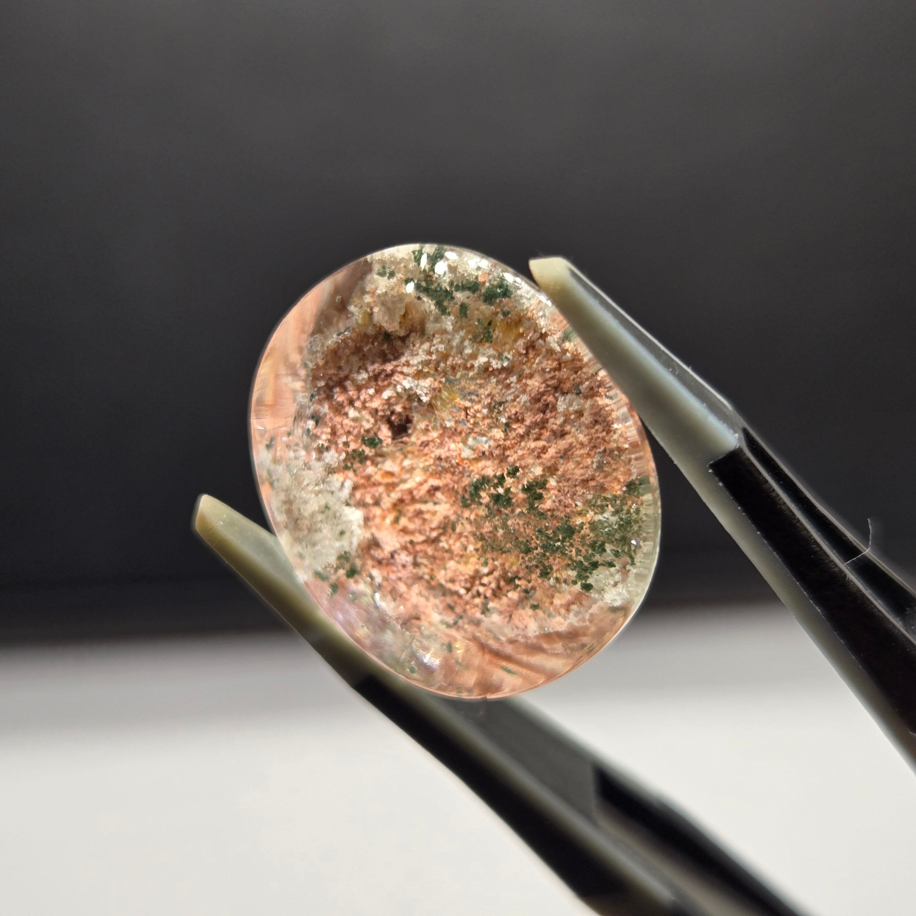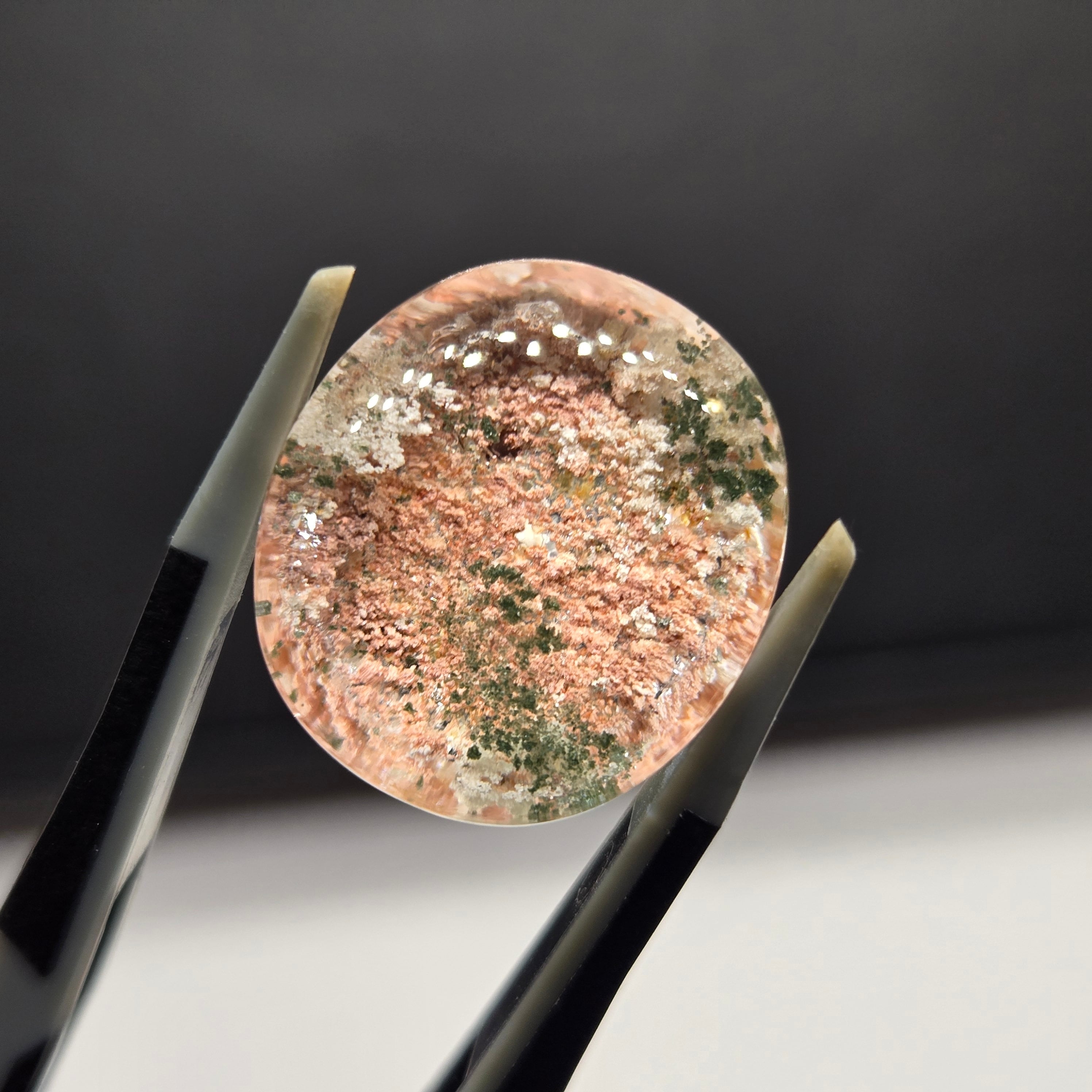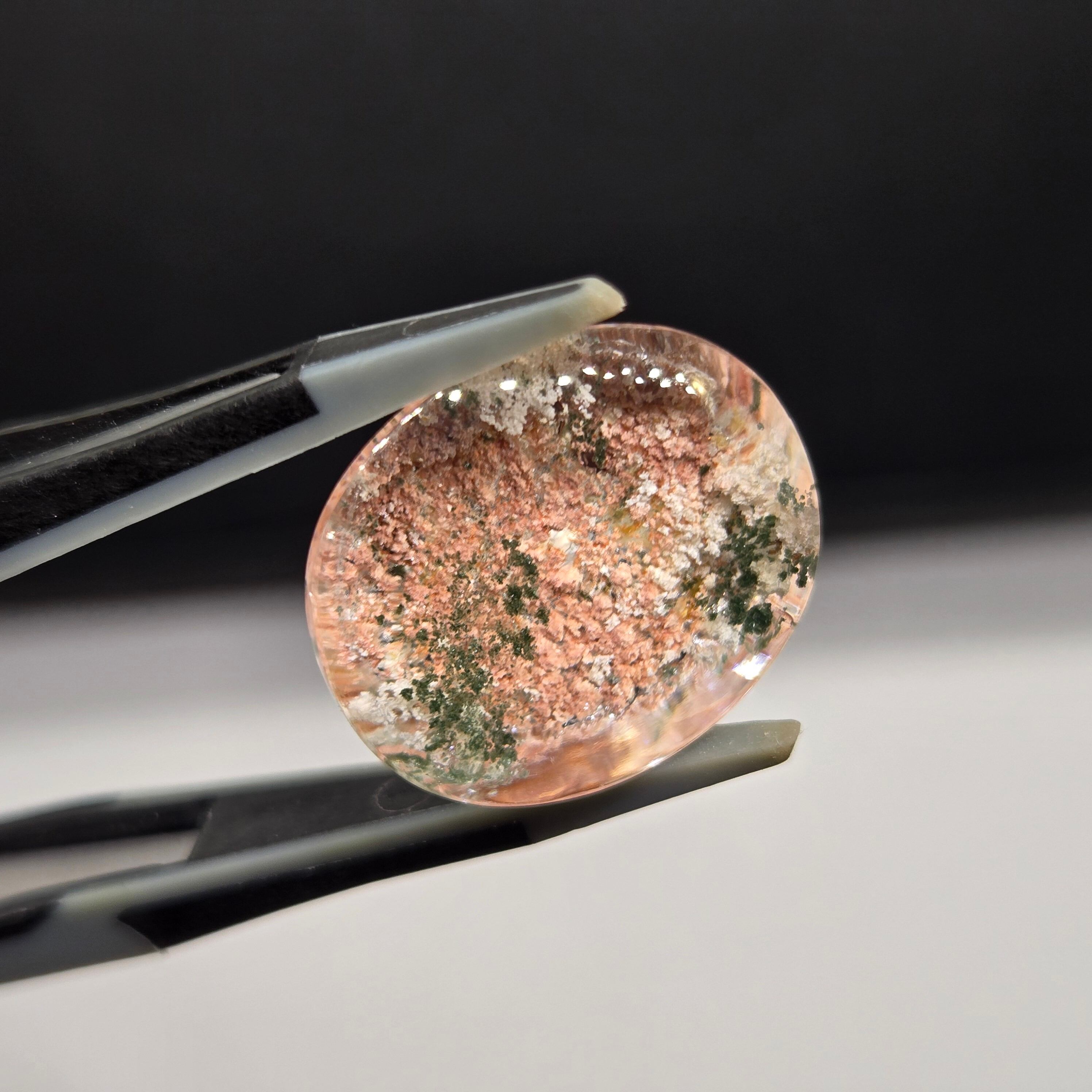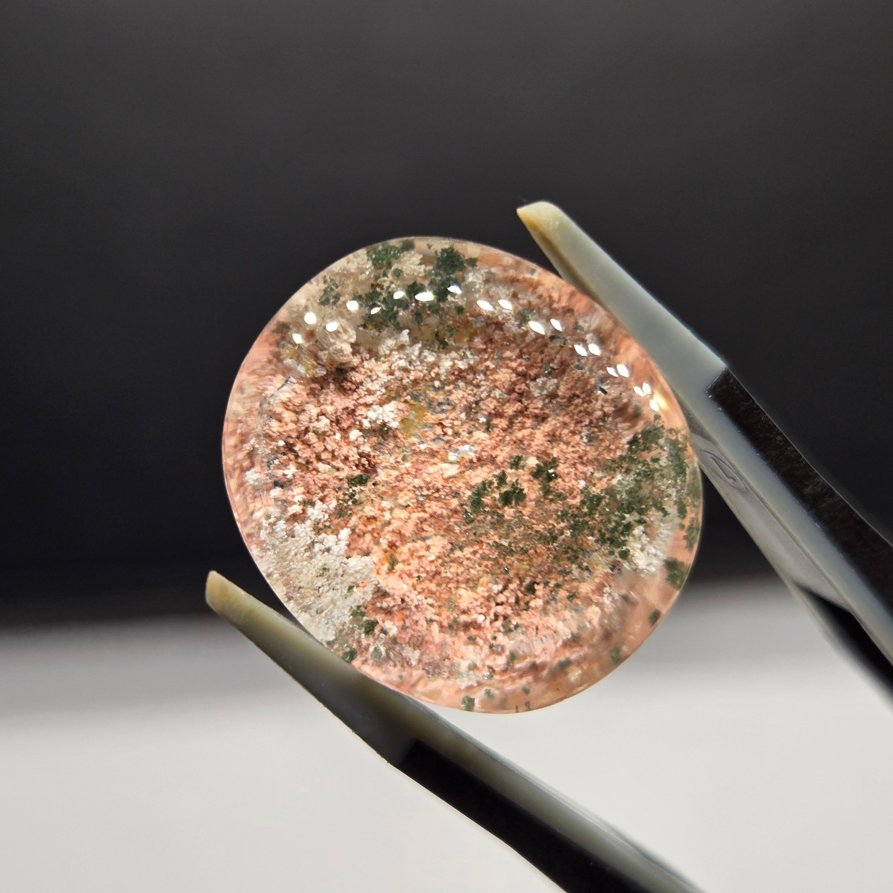 ・サーモンピンクに近い色を基調に、乳白色や緑色の内包物が見えます。