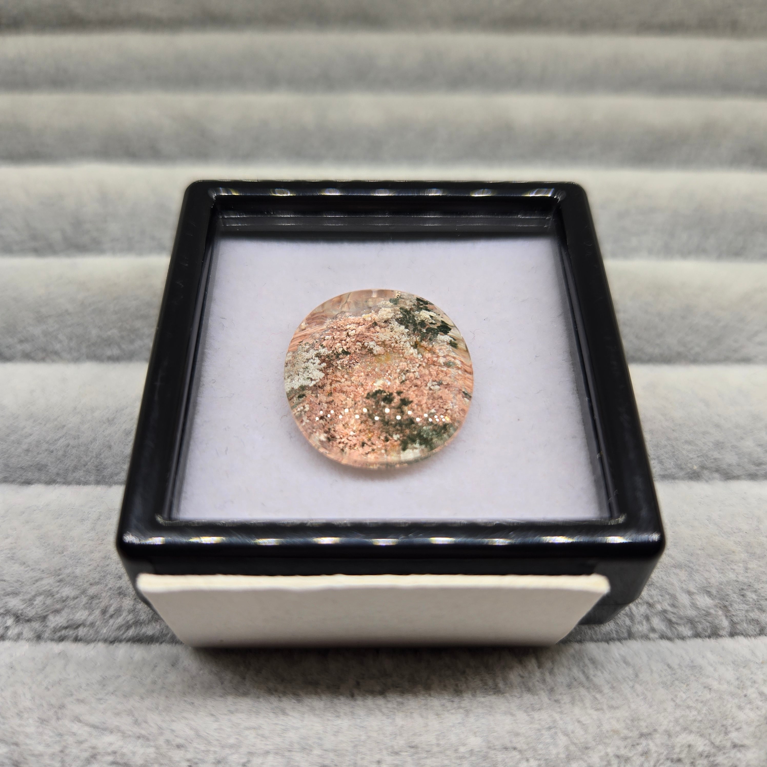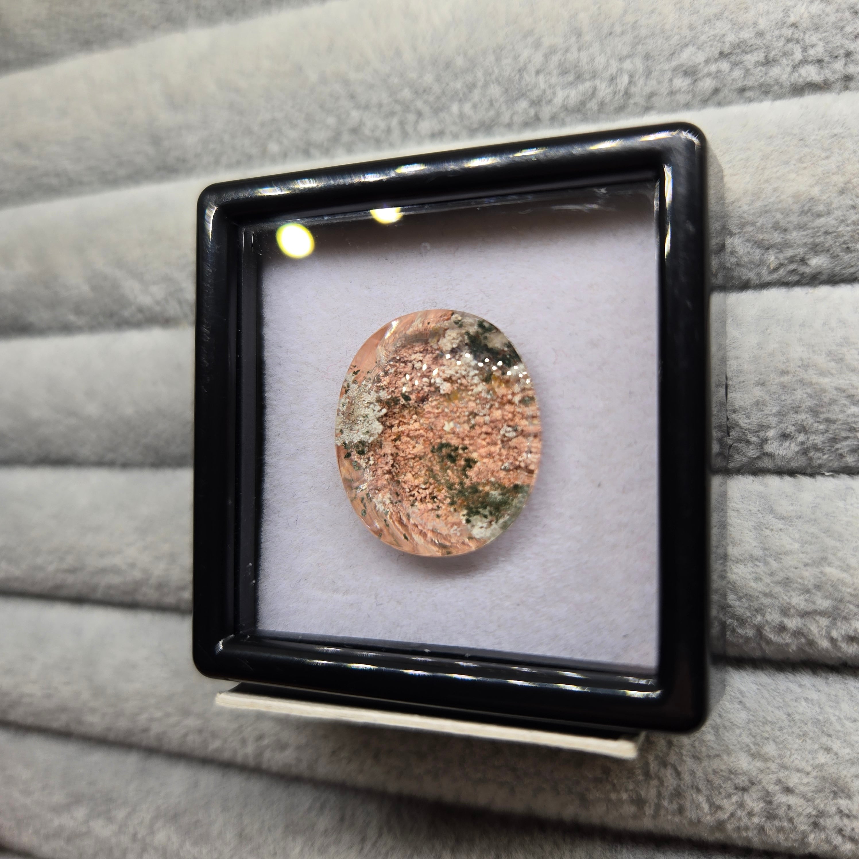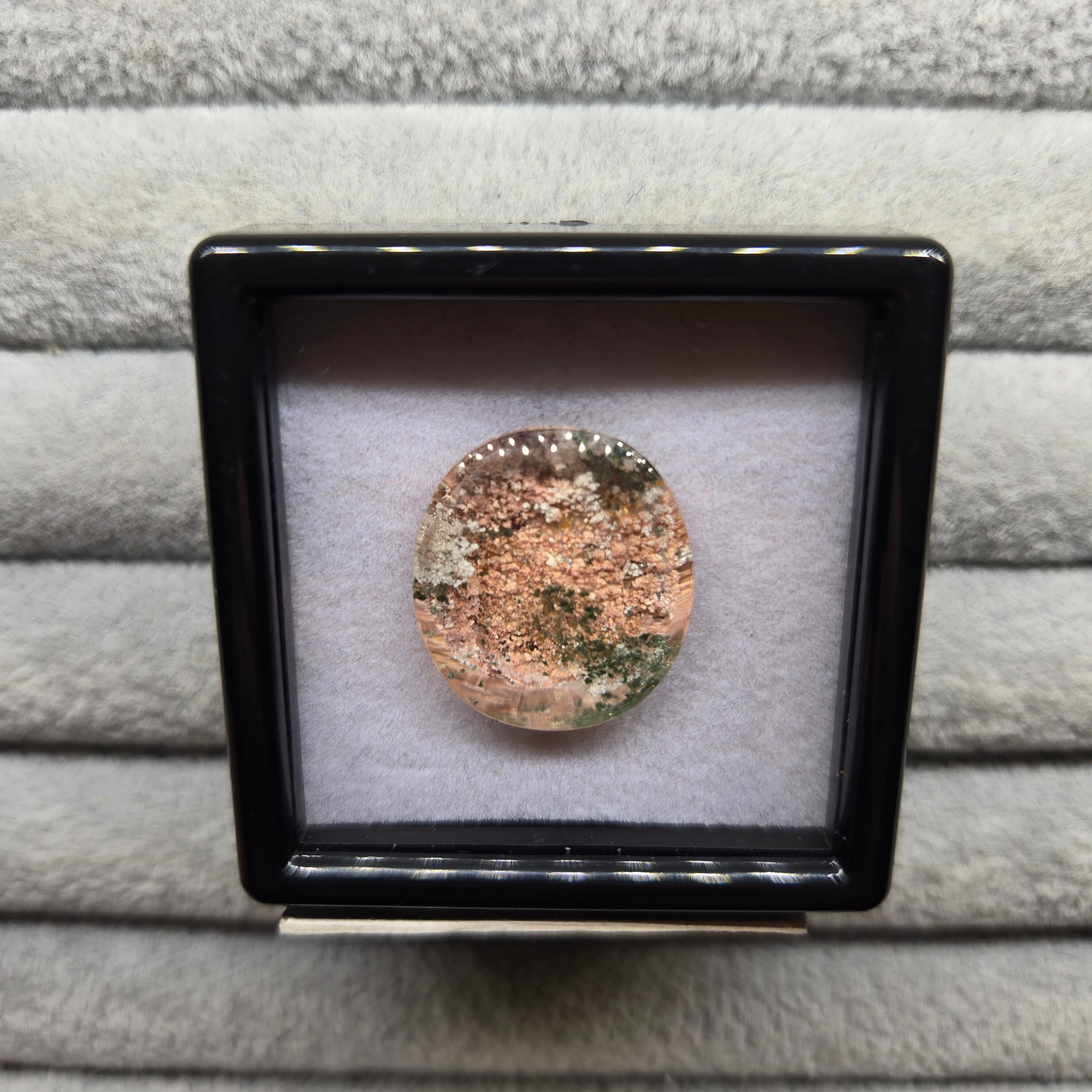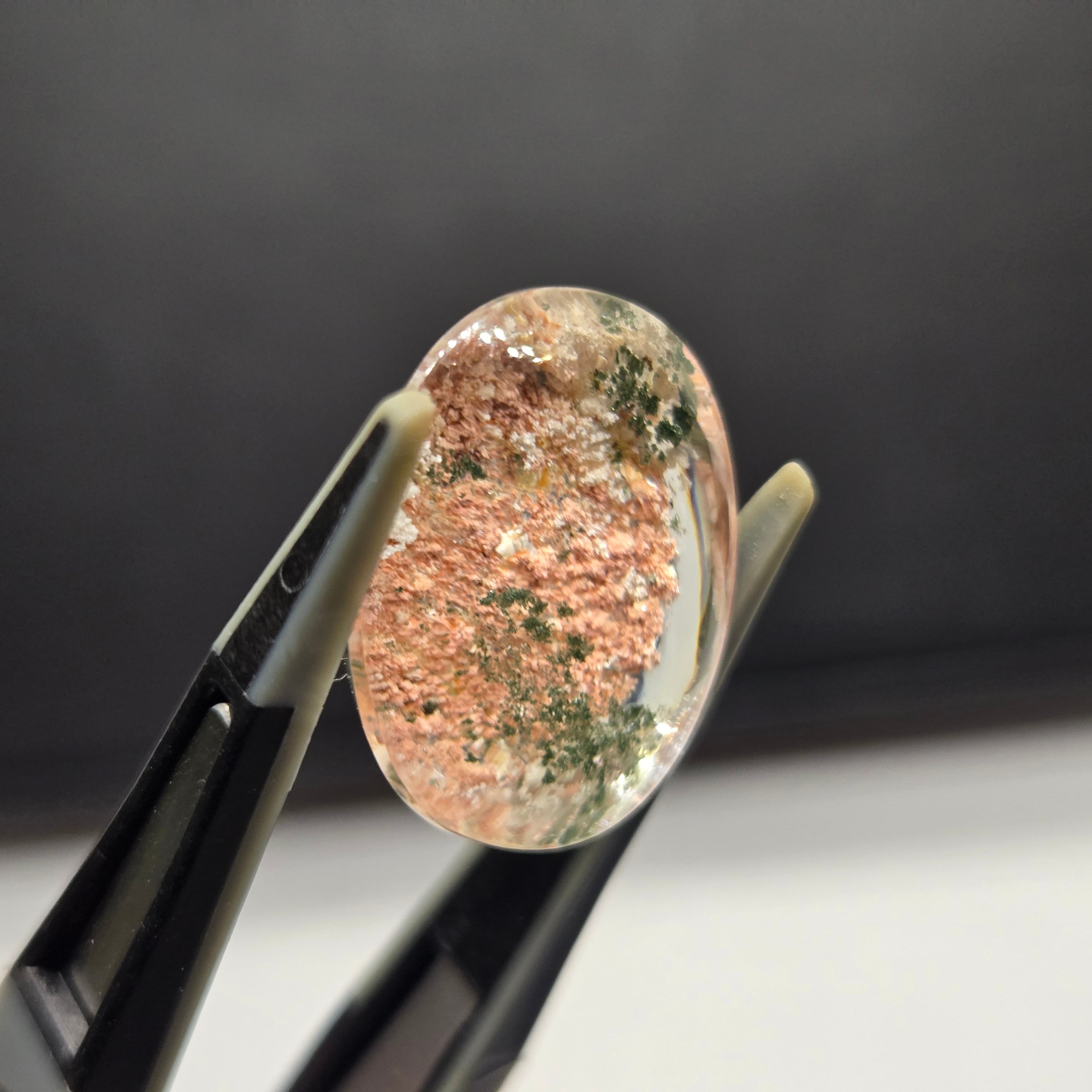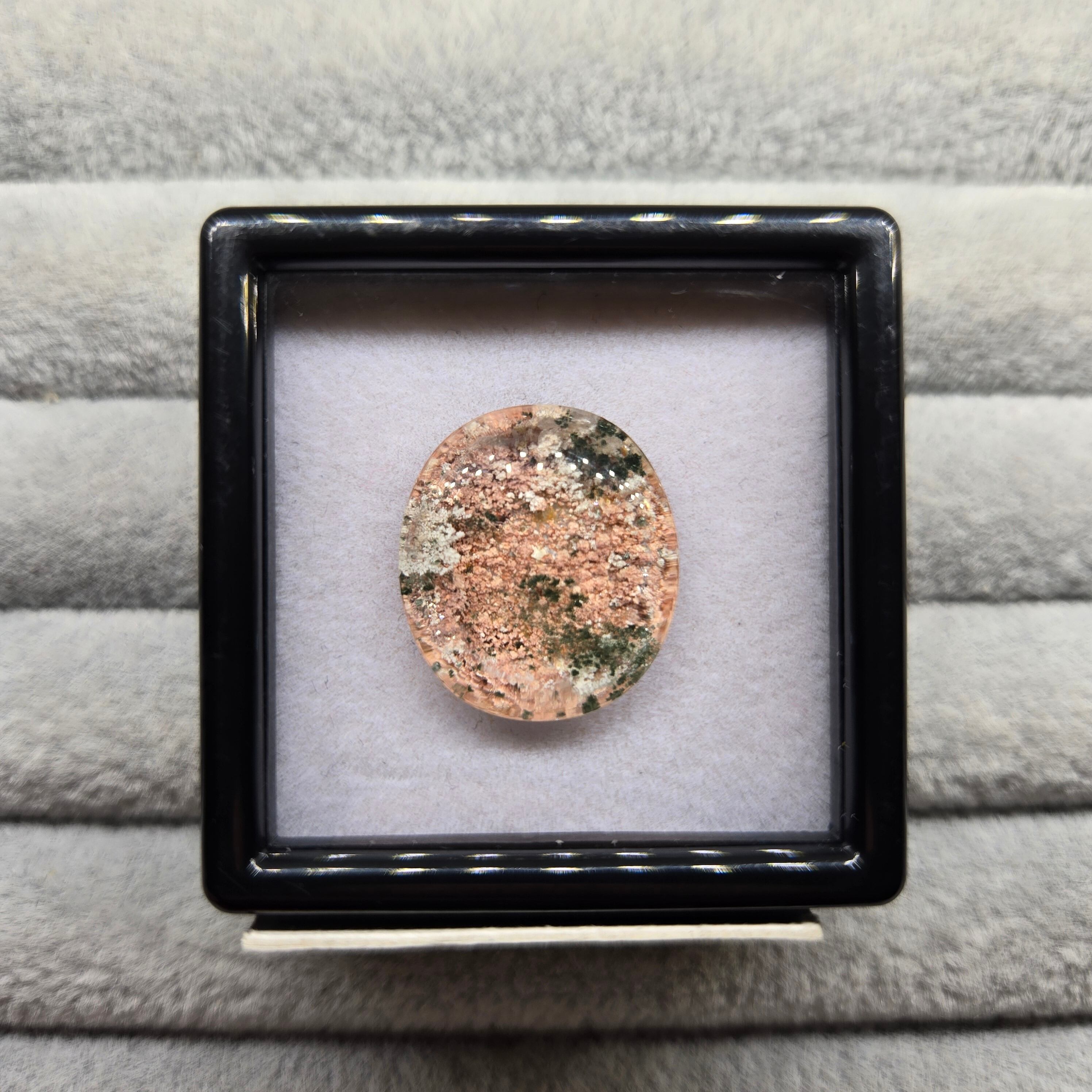 ・サーモンピンクに近い色を基調に、乳白色や緑色の内包物が見えます。