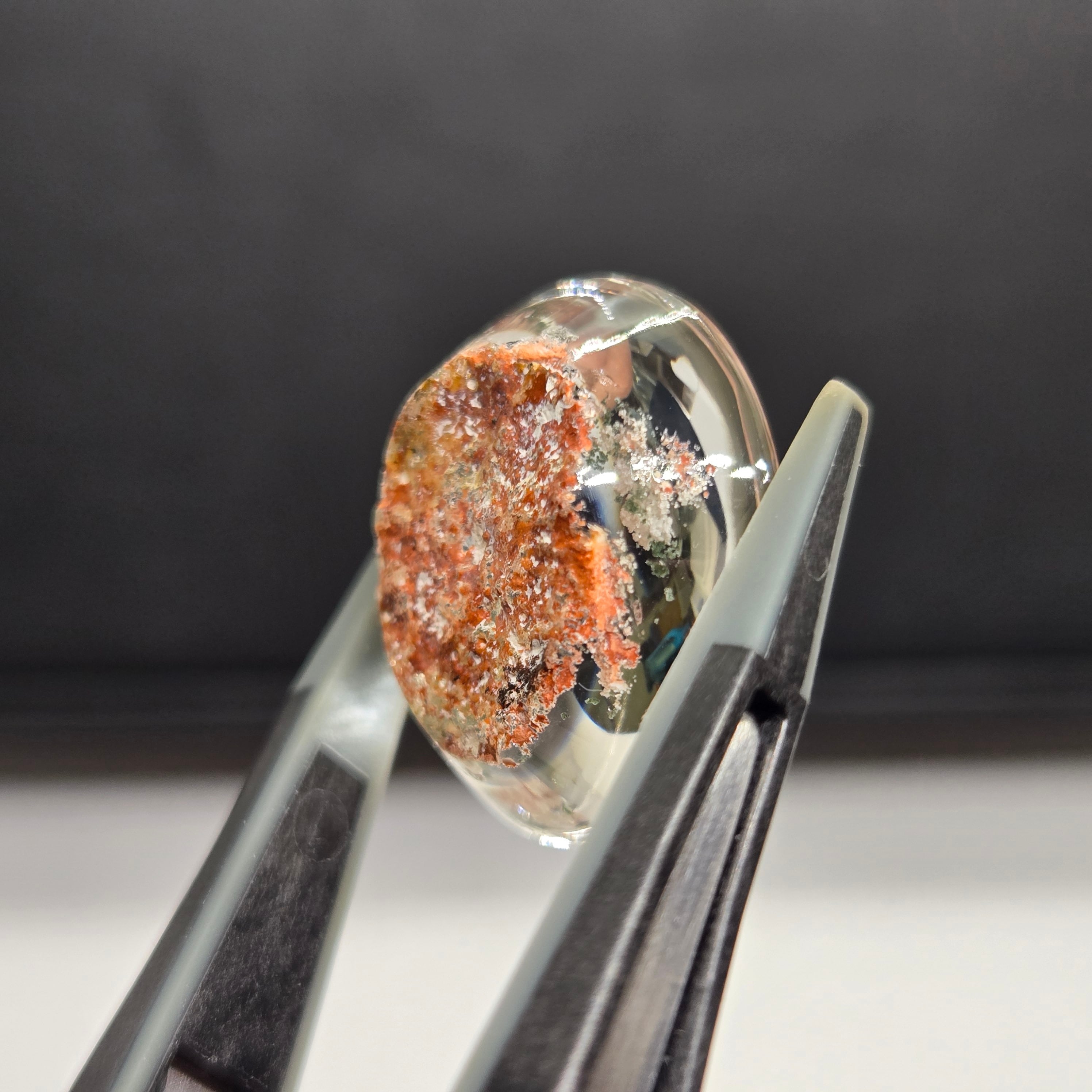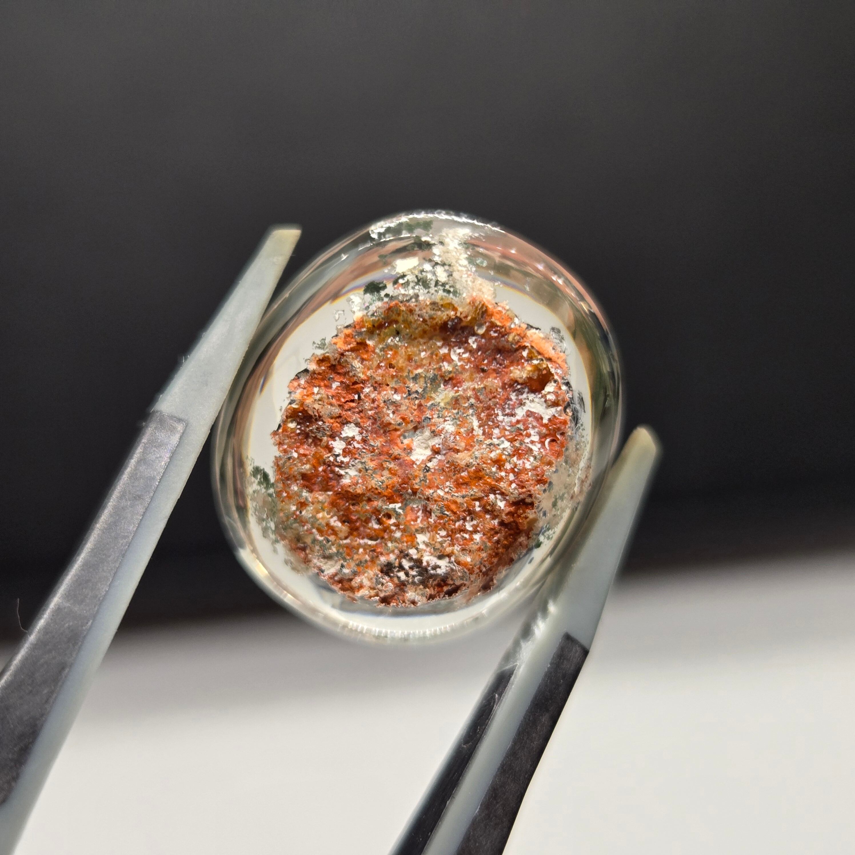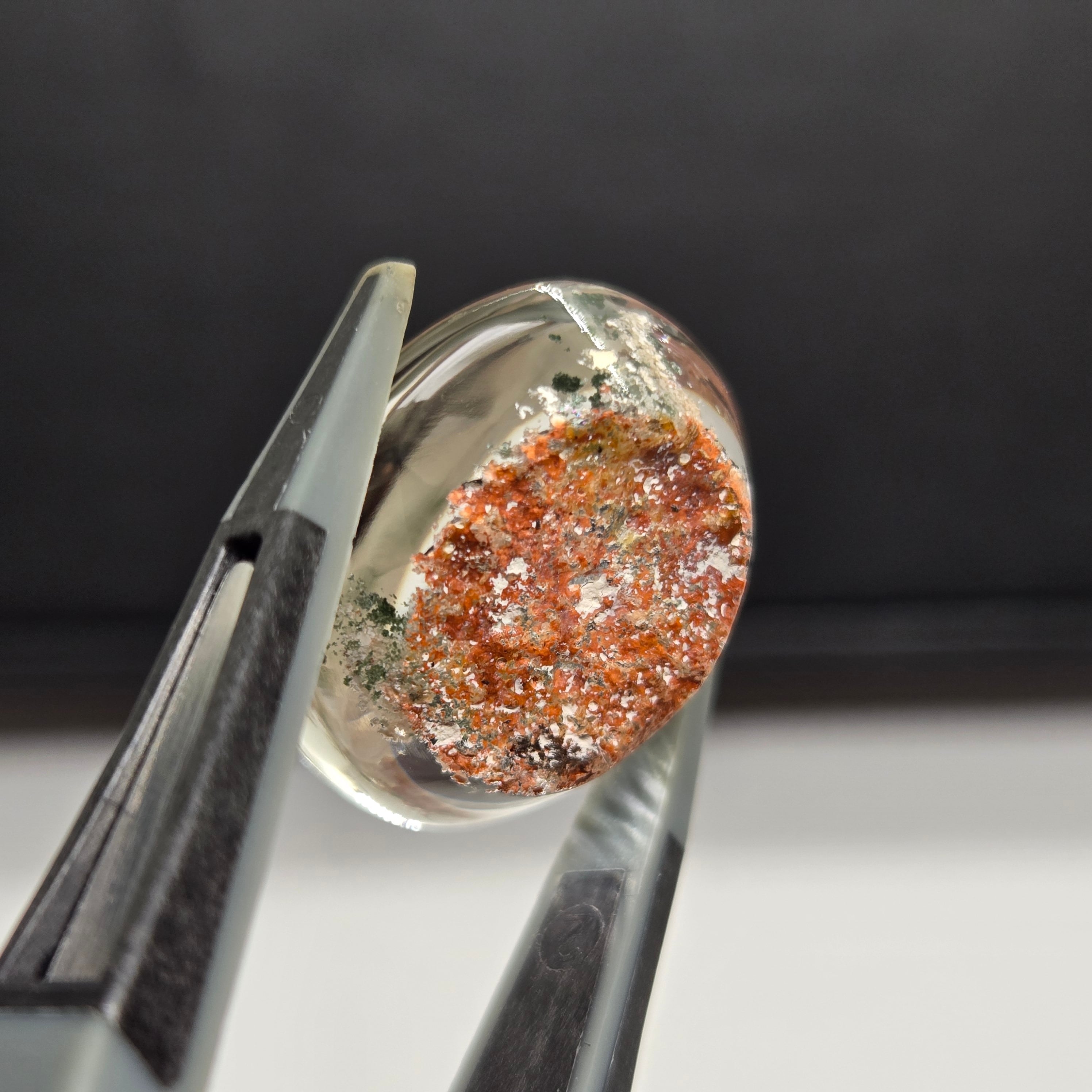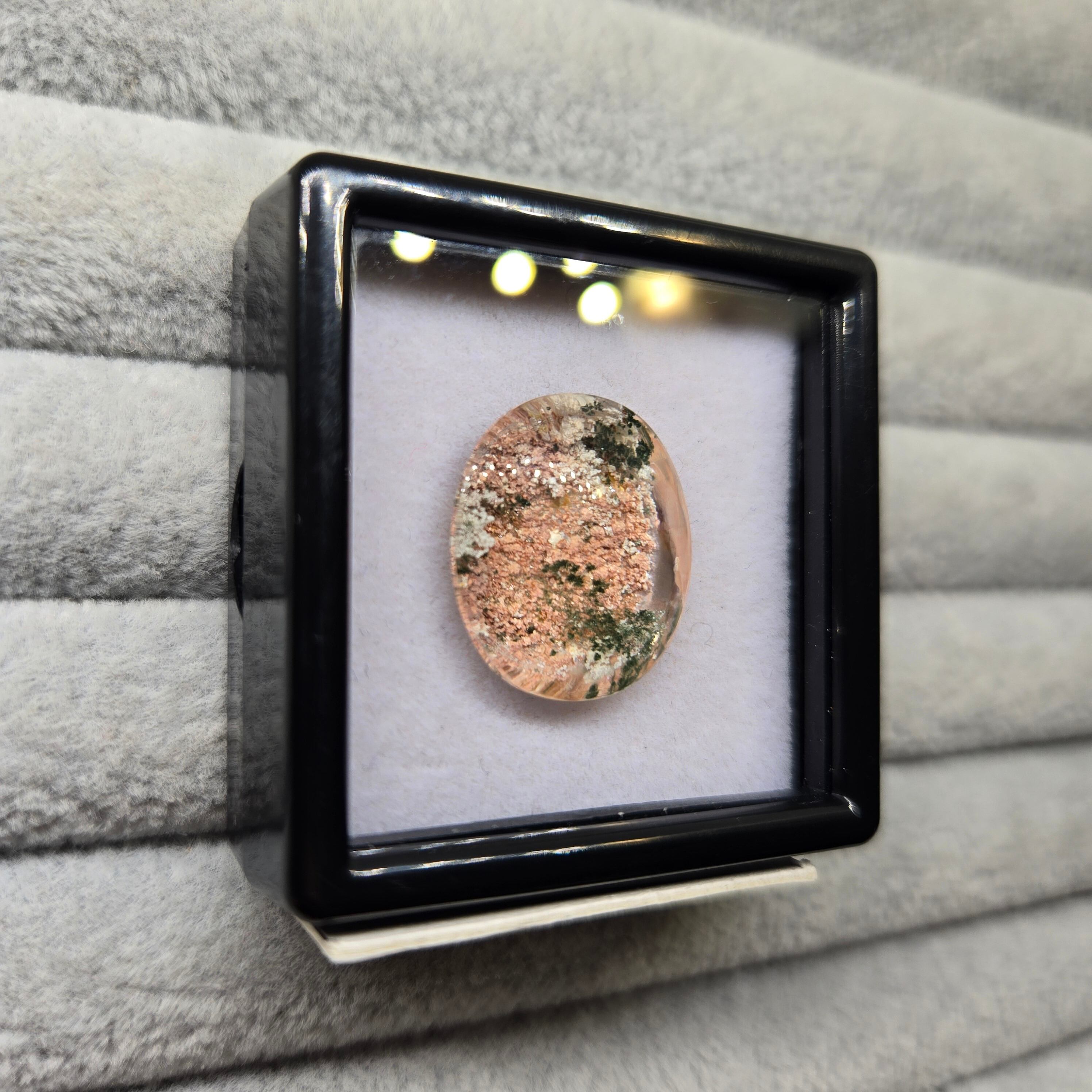 ・サーモンピンクに近い色を基調に、乳白色や緑色の内包物が見えます。
