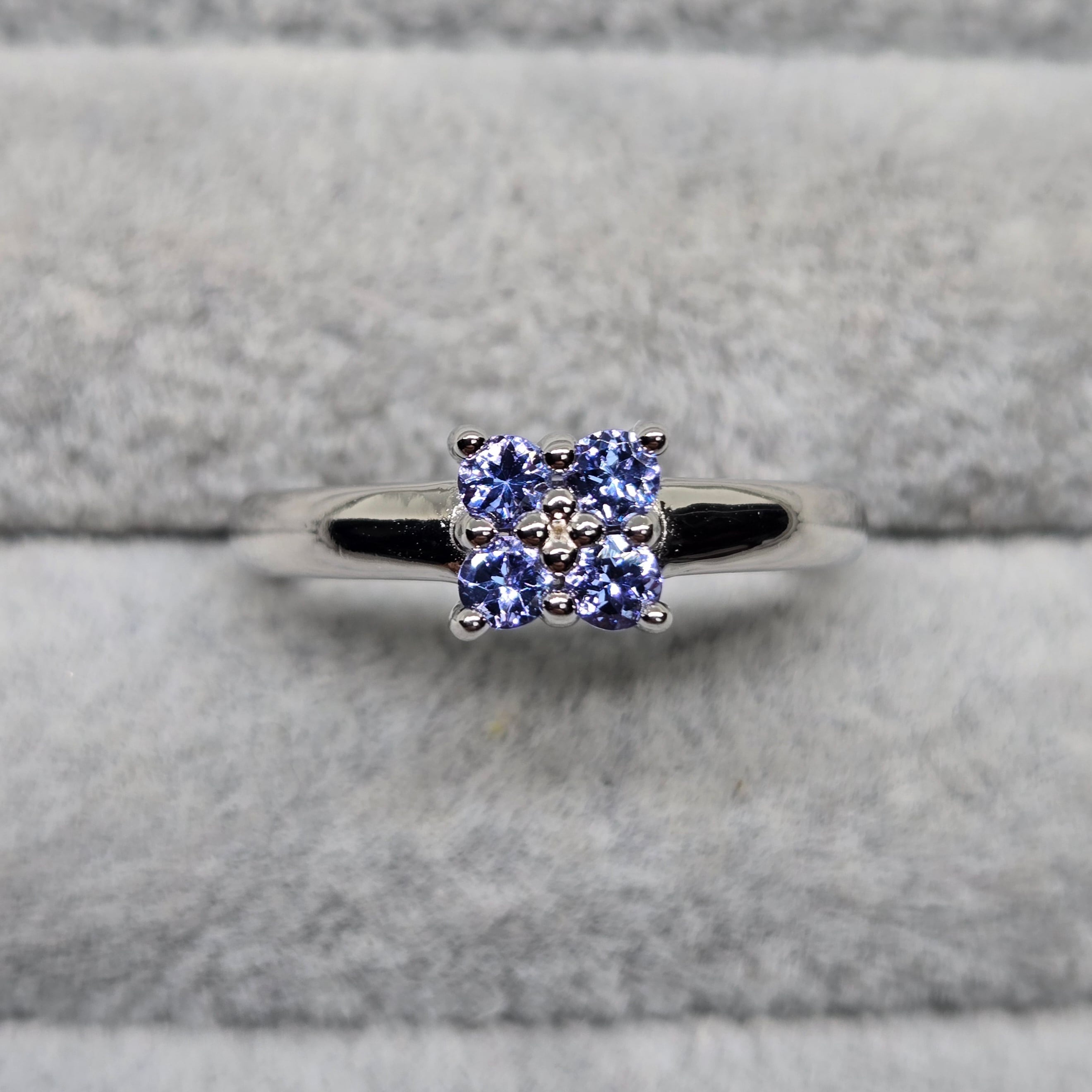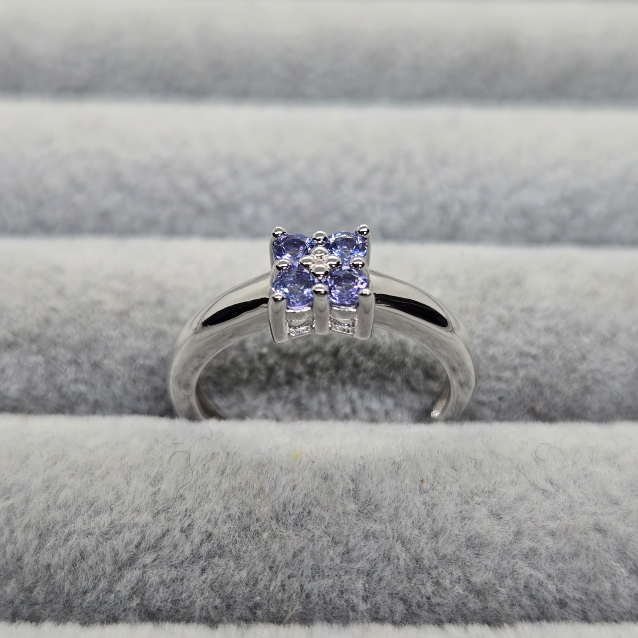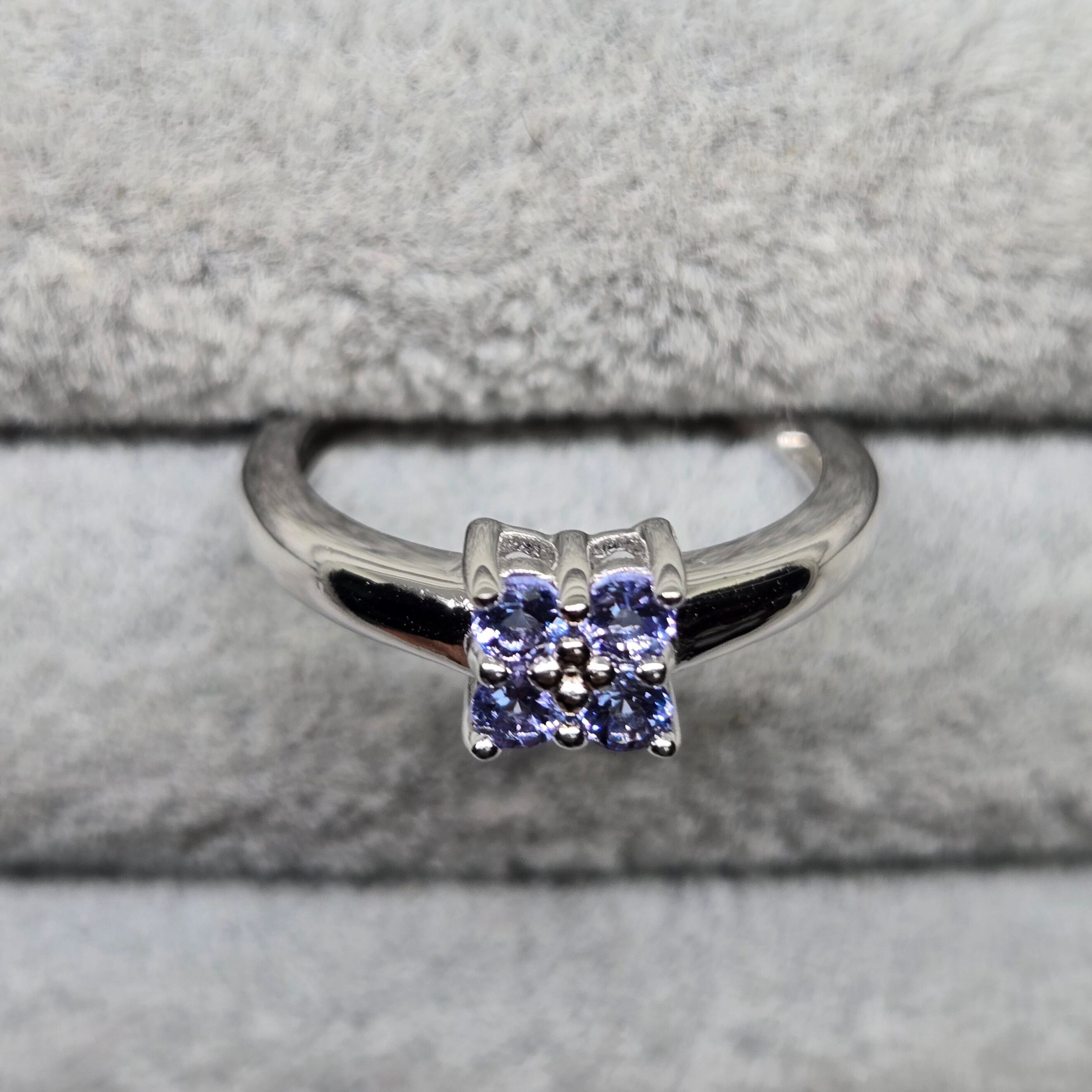 ・約2ミリのライトカラーのタンザナイトを4石用い、四葉のようにも見えるシルバーリングです。