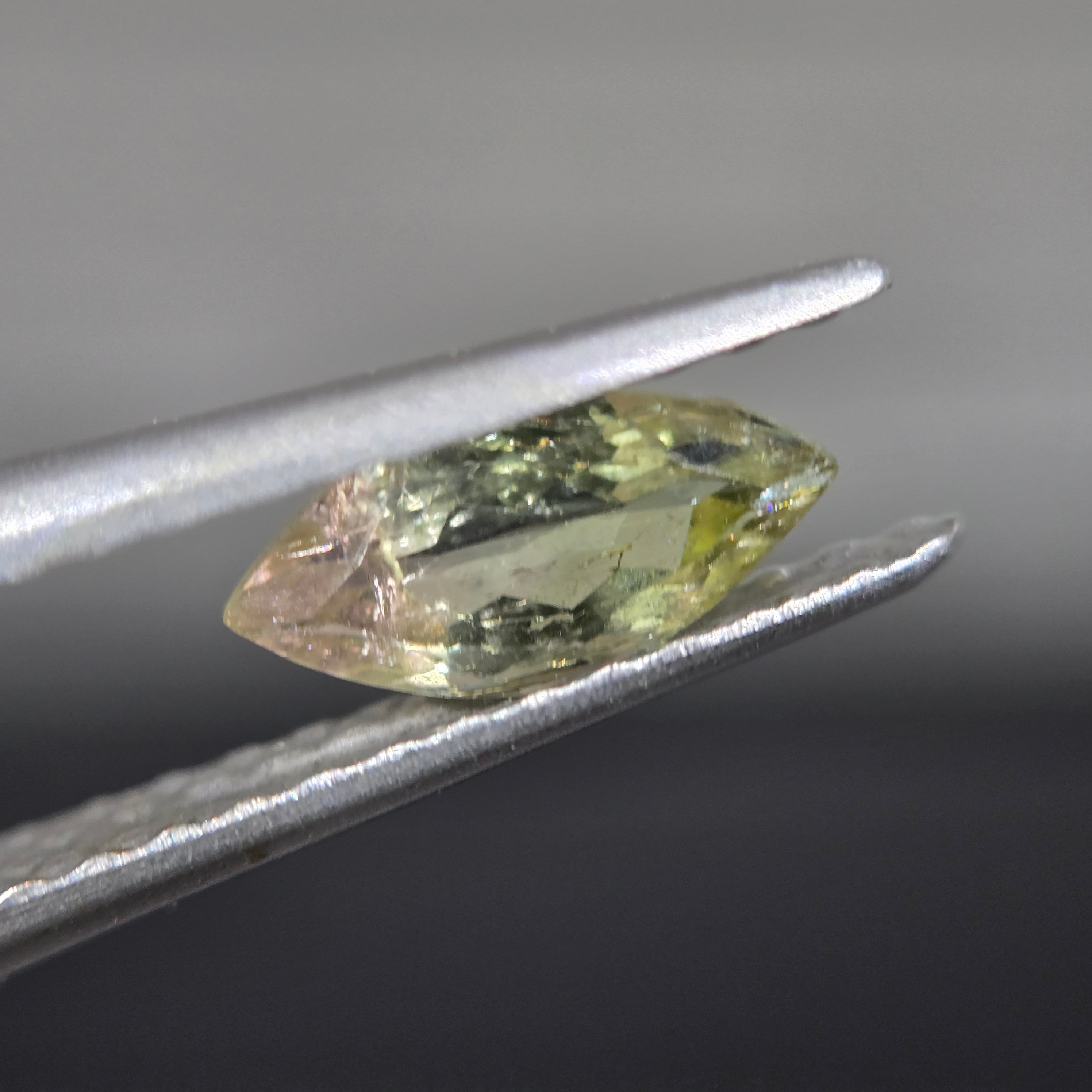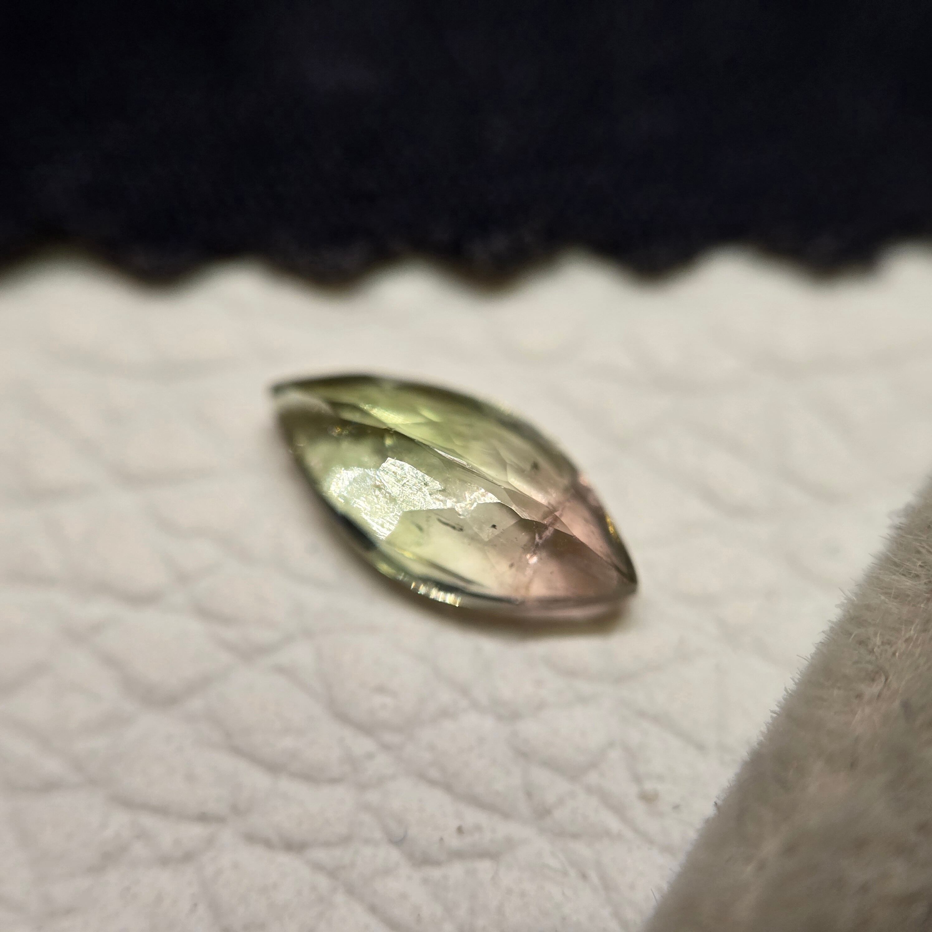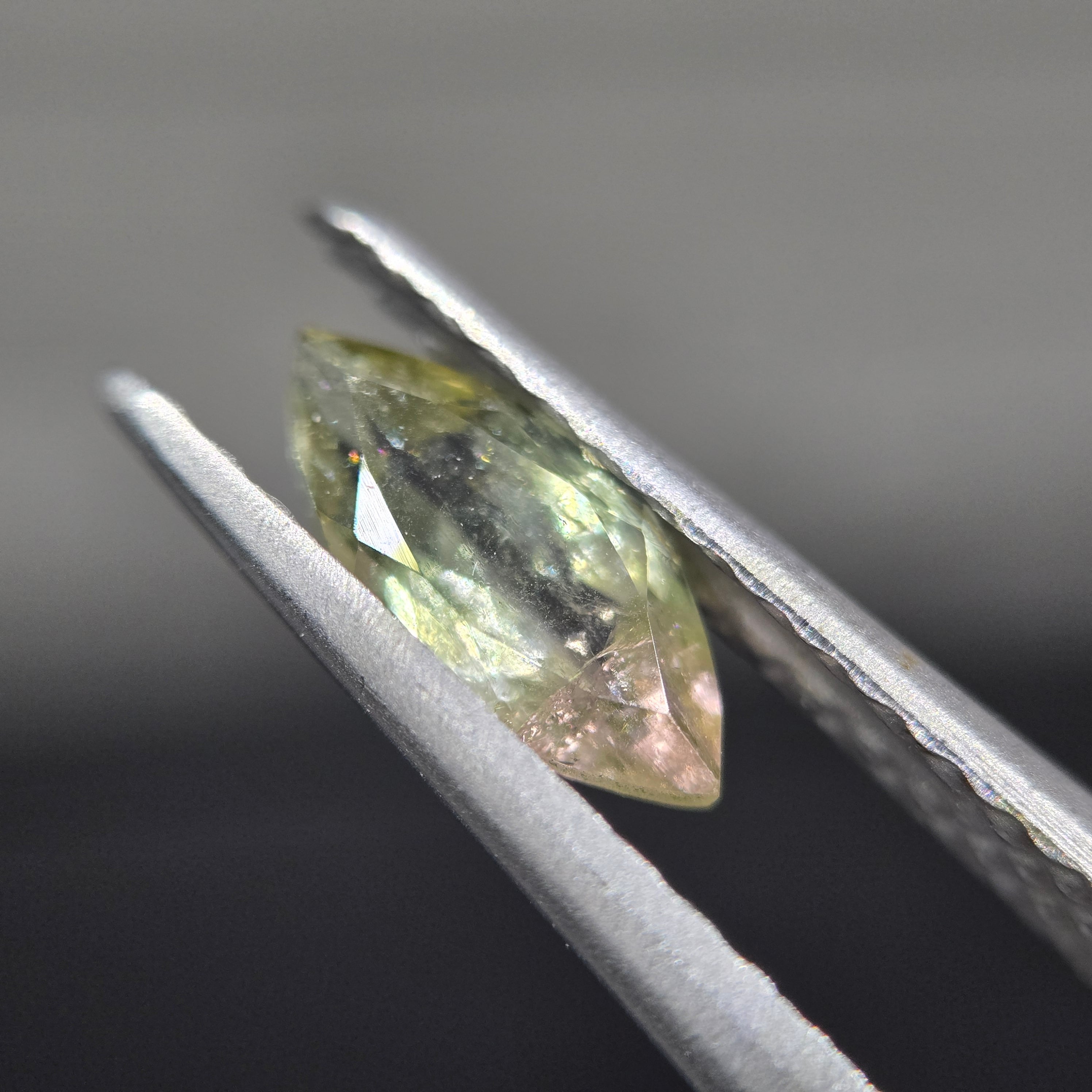 ・微細な内包物、クラックなどあり、極わずかですが、クラックに伴うイリデッセンス(虹色の見える現象)が見えます。かなりわずかなので、肉眼では捉えにくいです。