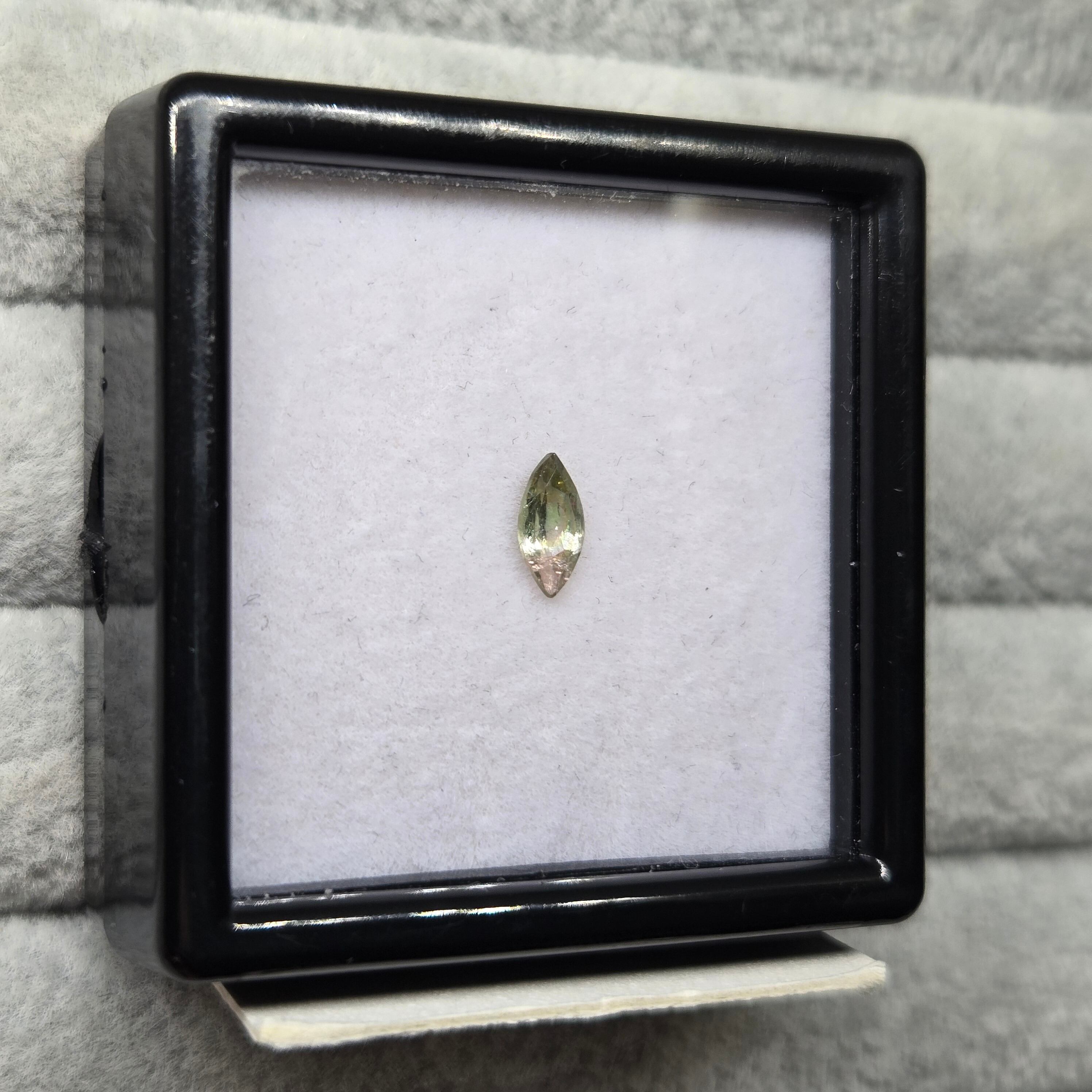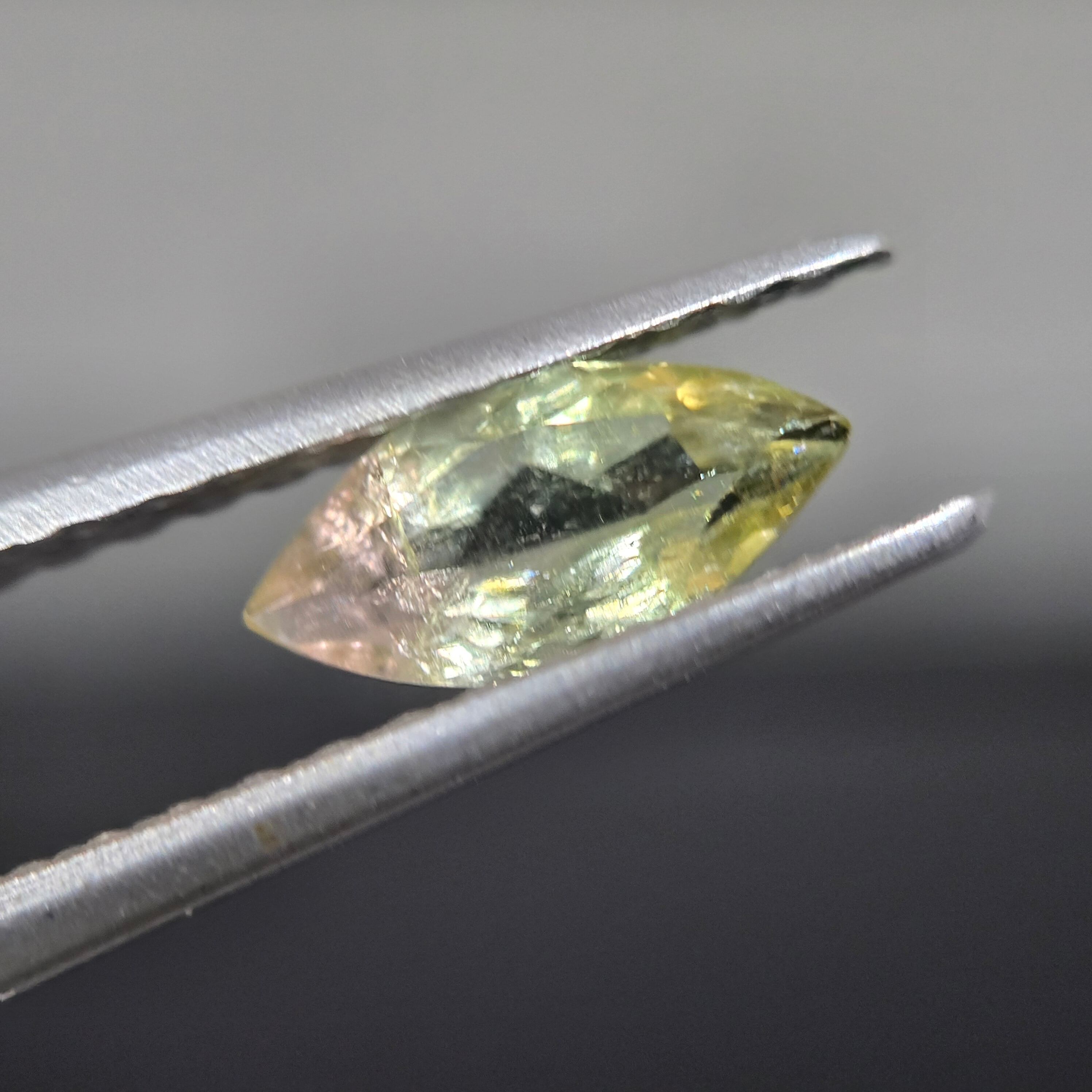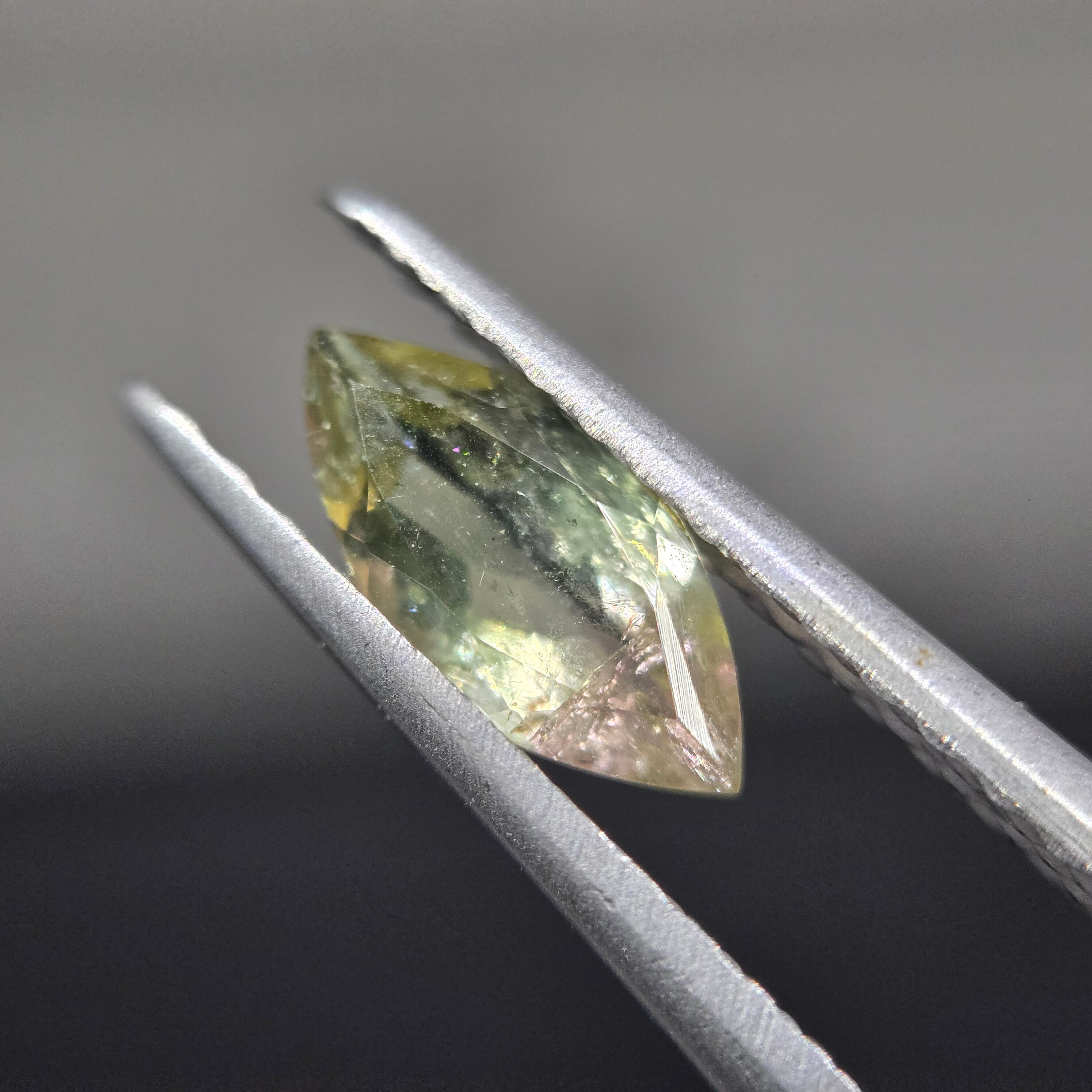 ・微細な内包物、クラックなどあり、極わずかですが、クラックに伴うイリデッセンス(虹色の見える現象)が見えます。かなりわずかなので、肉眼では捉えにくいです。
