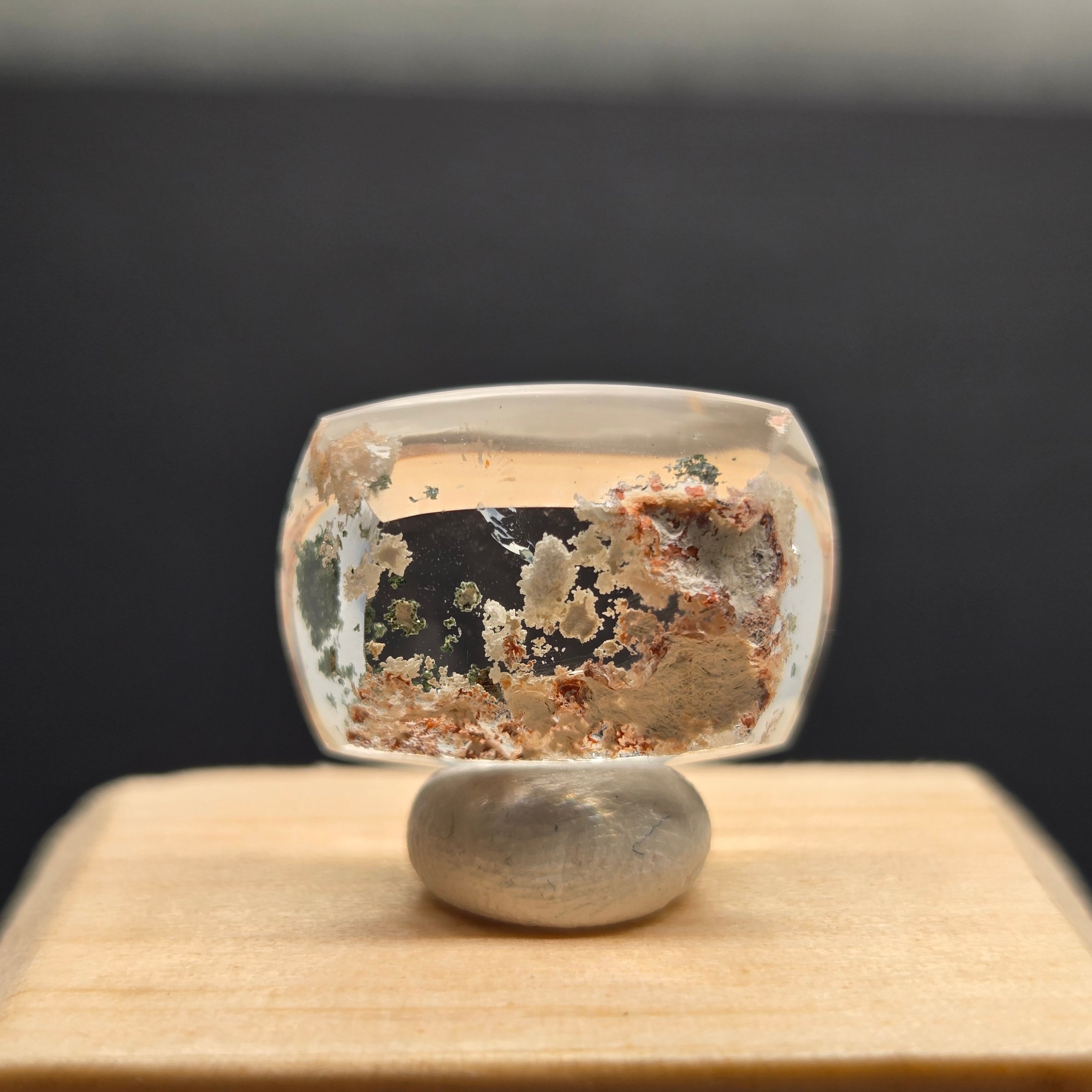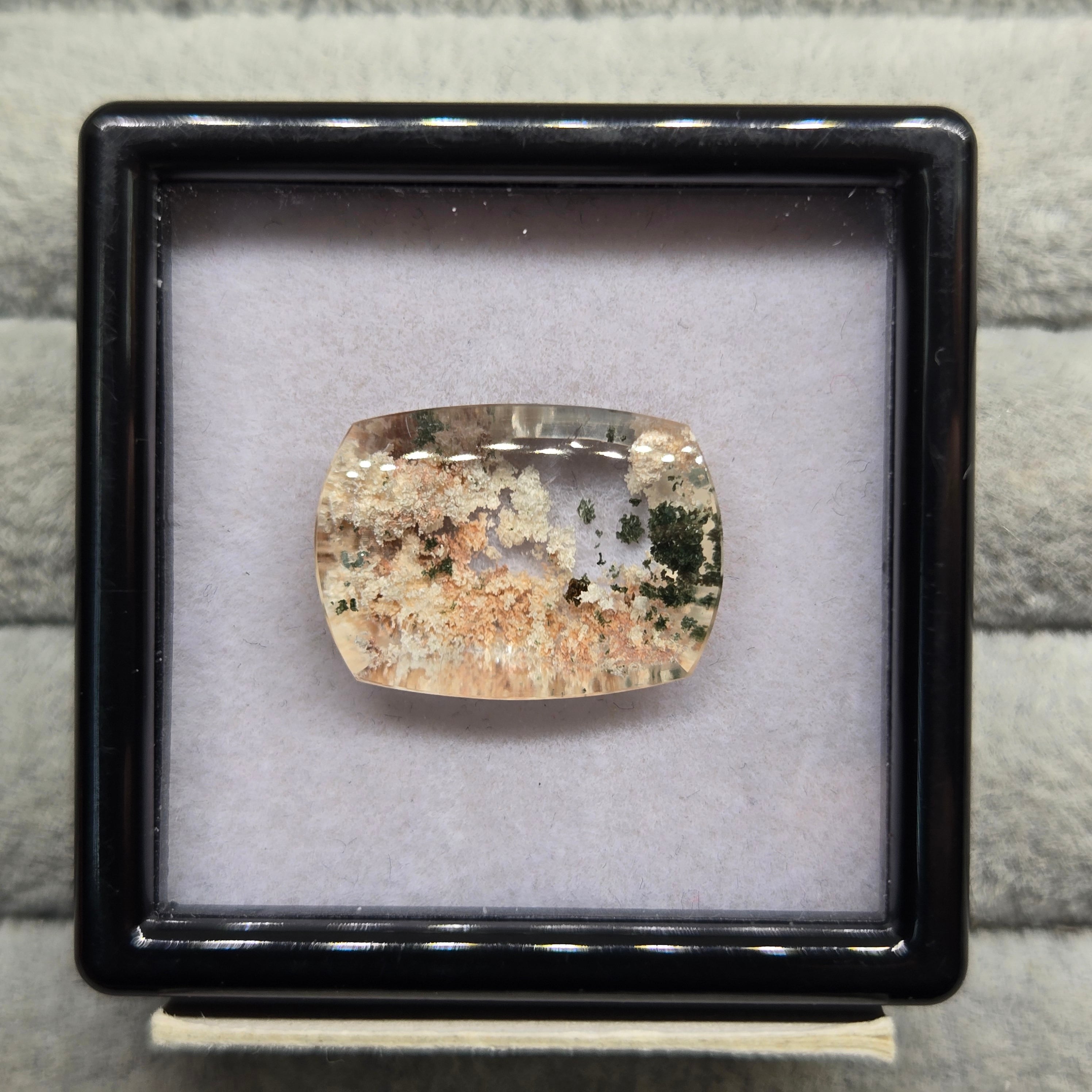 ・透明感あるクォーツの中に白や肌色、緑色の内包物を見ることができます。