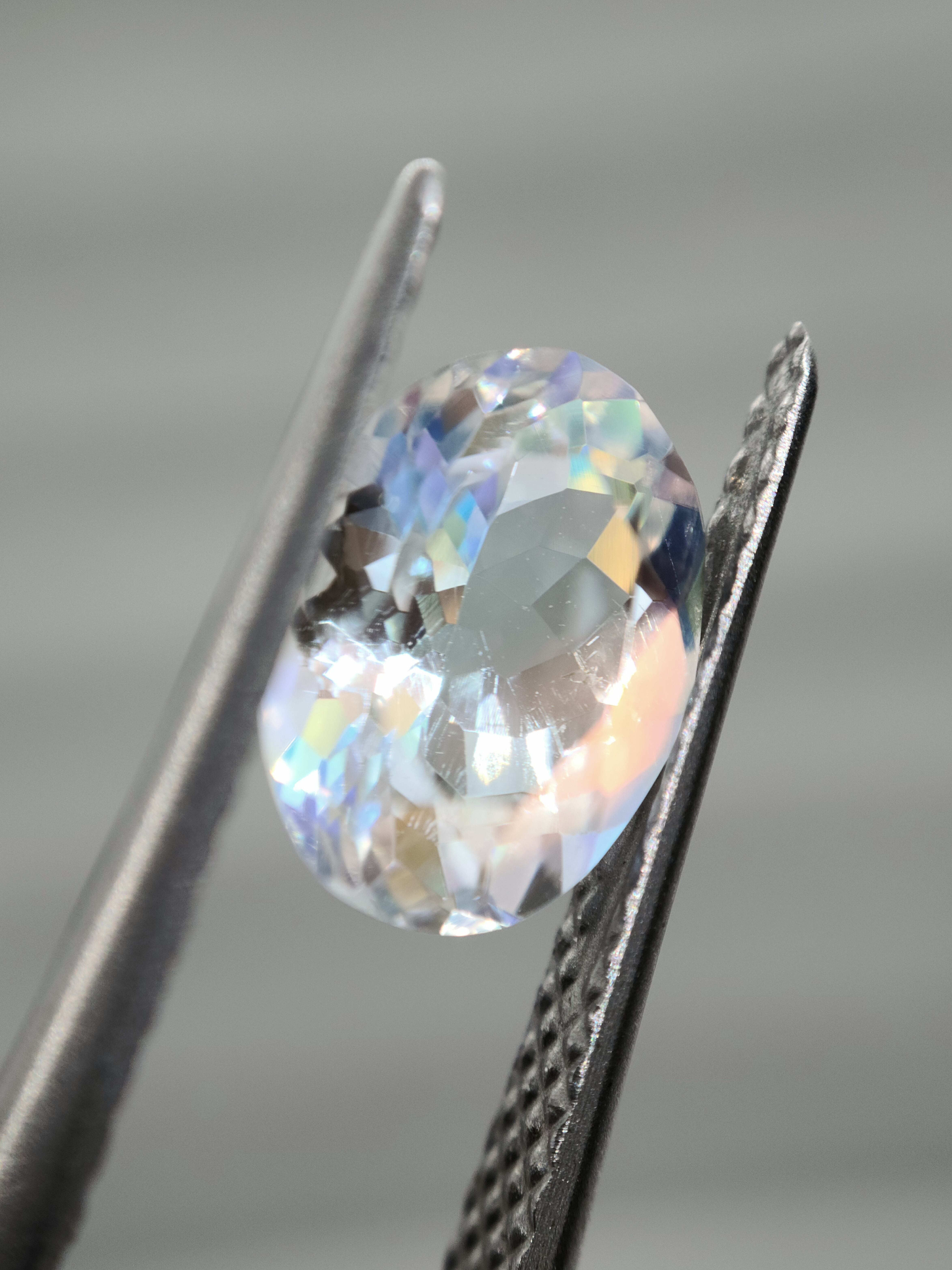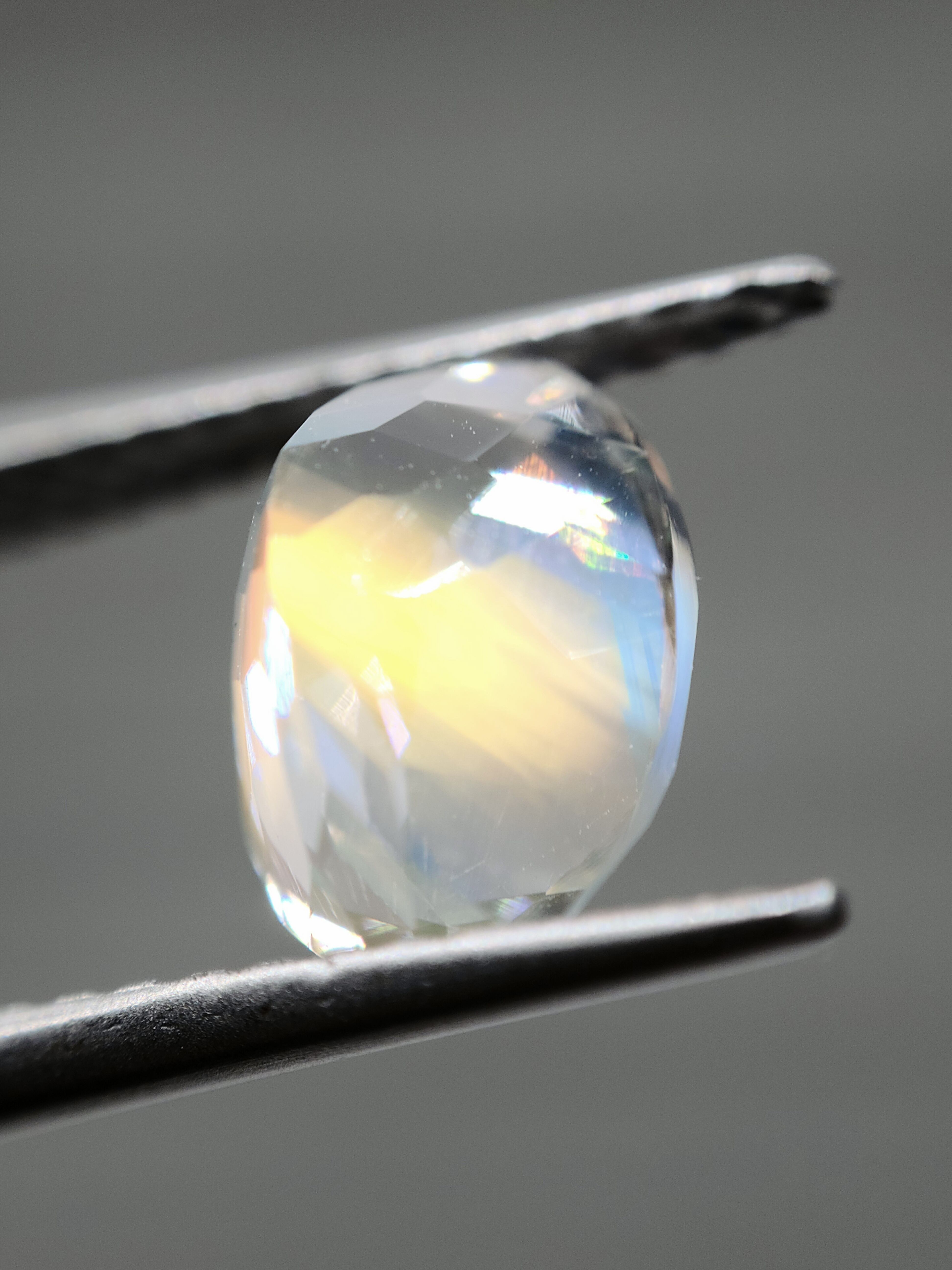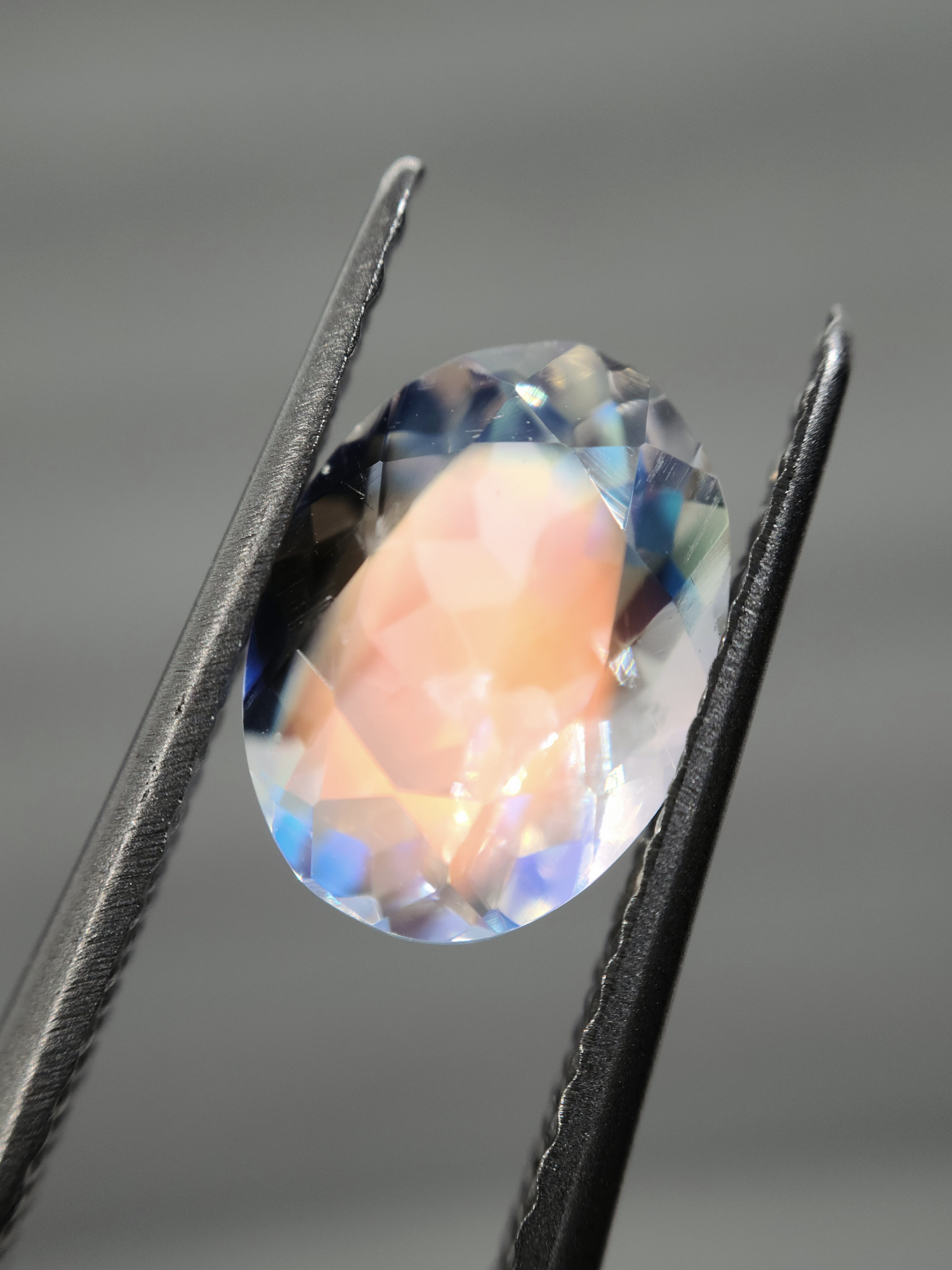 内包物、ファセットのエッジ部分の荒らさなどがわずかに見られますが、透明度も高く、オレンジ色を主としたシラーが見えるピースです。