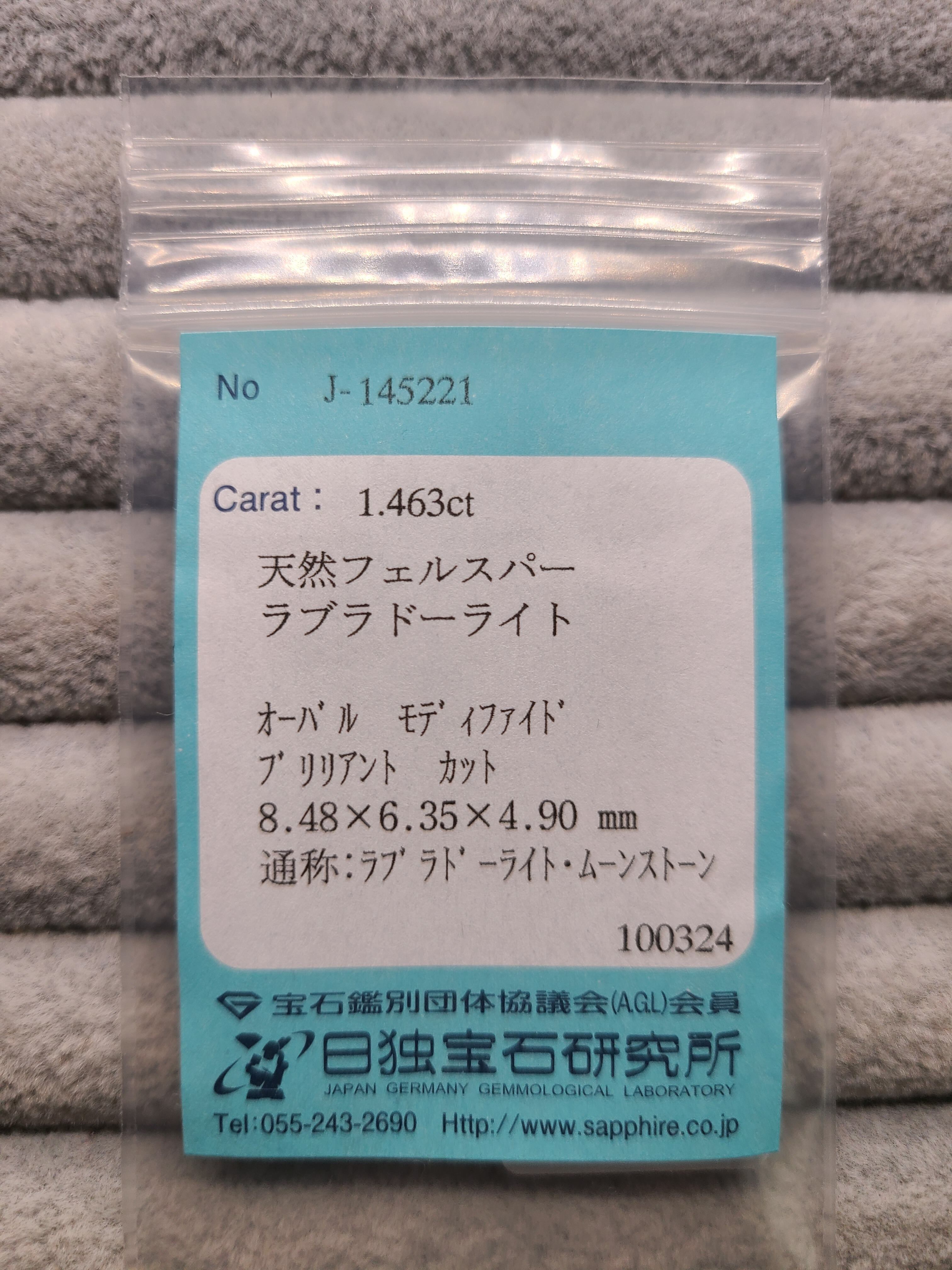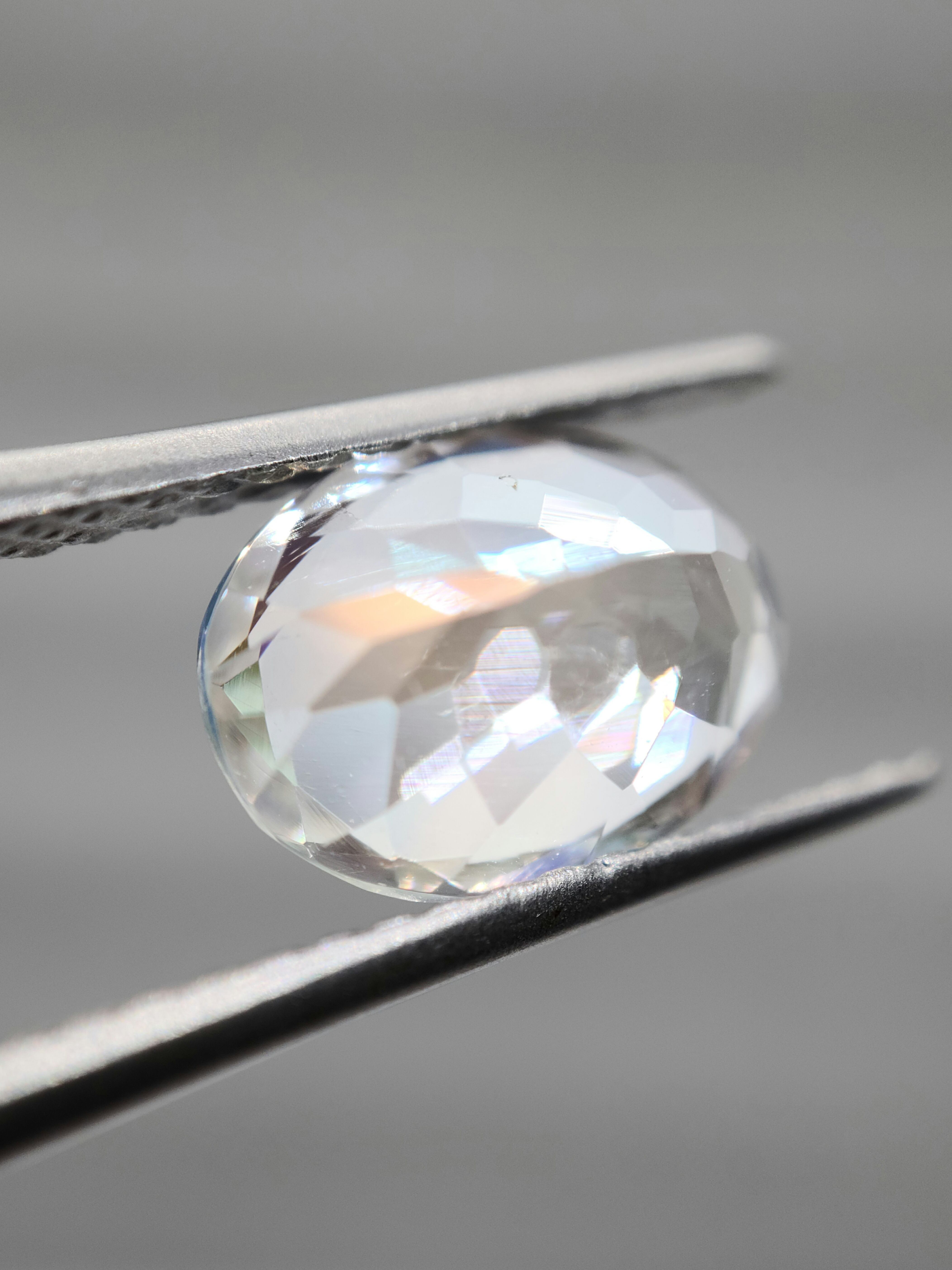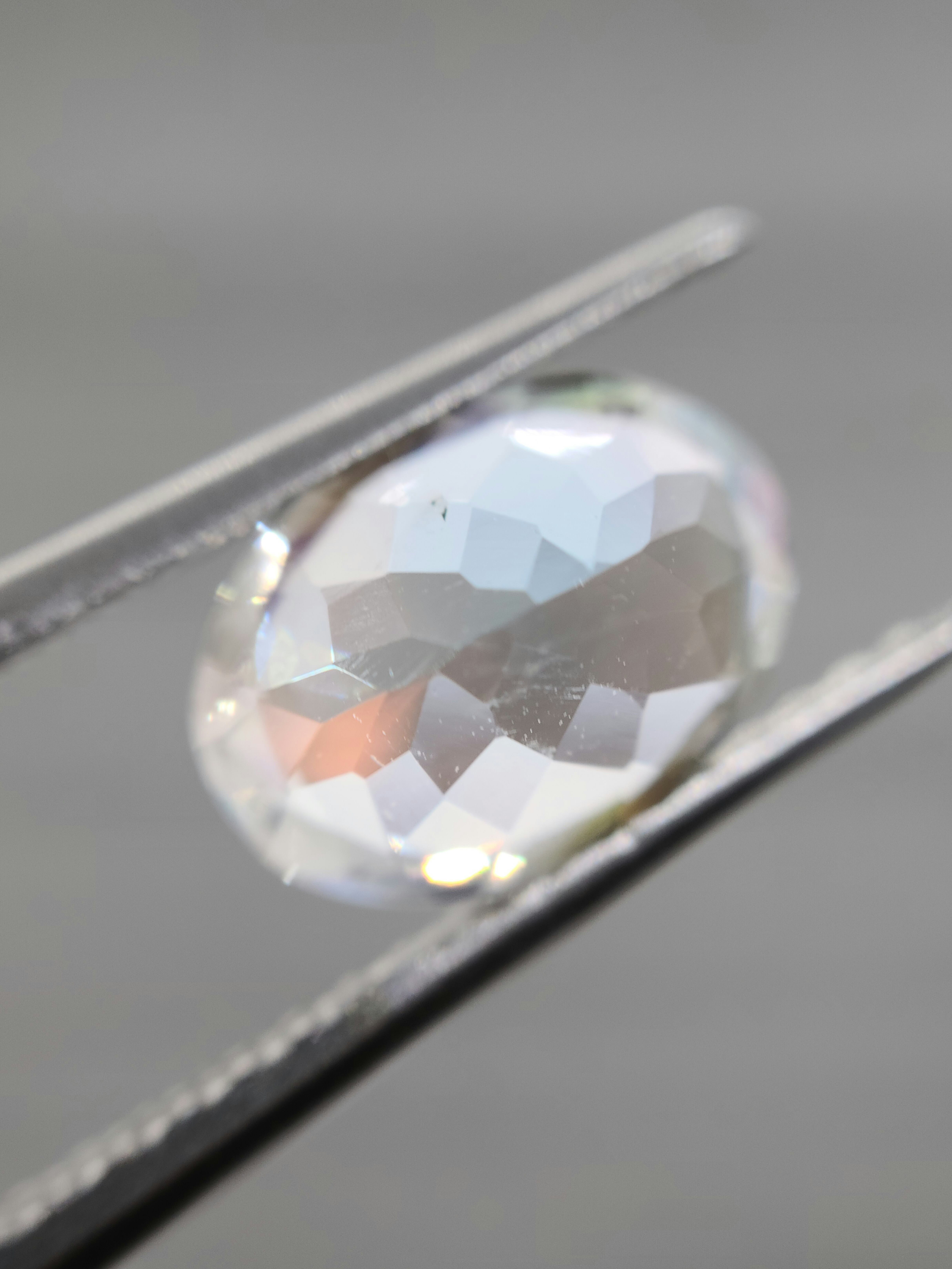 内包物、ファセットのエッジ部分の荒らさなどがわずかに見られますが、透明度も高く、オレンジ色を主としたシラーが見えるピースです。