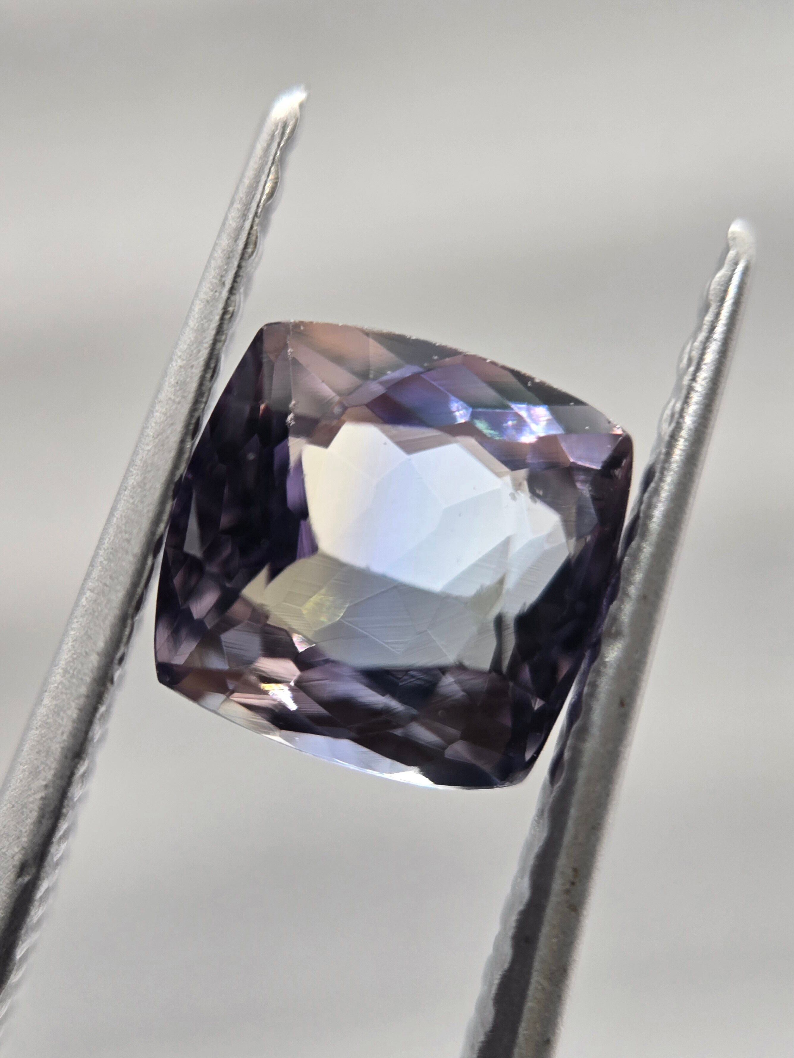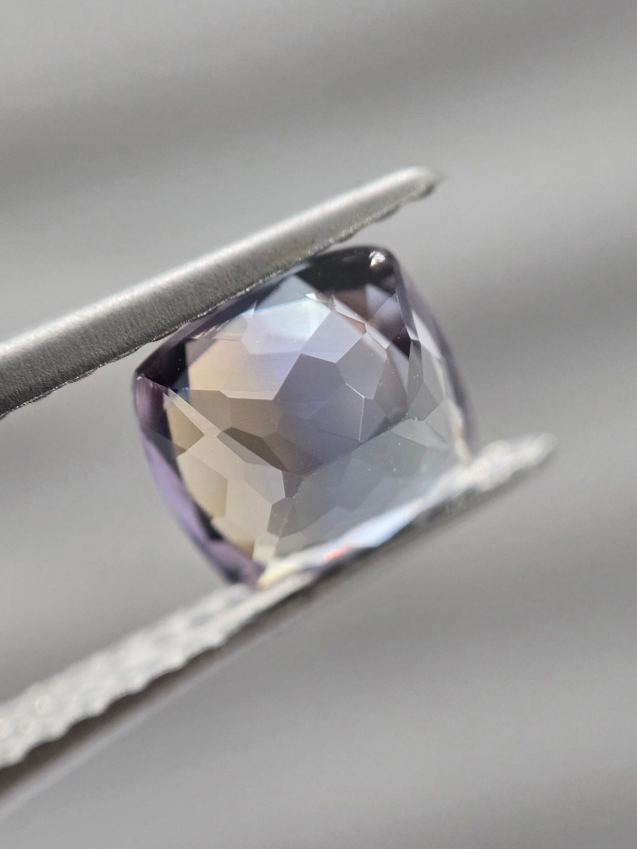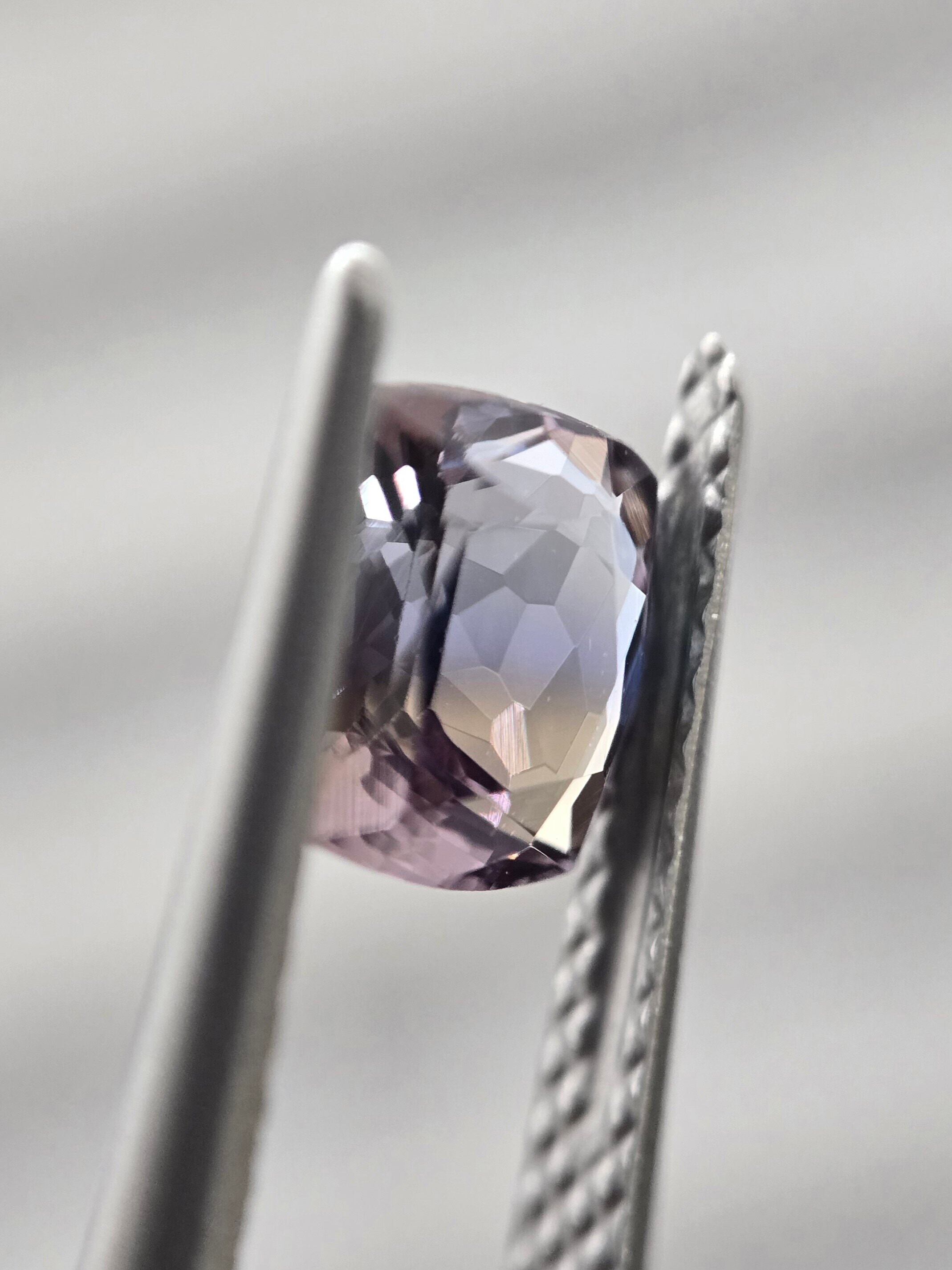 中央に帯状に青色が入り、それを挟んで褐色と薄めのパープルが見えるトリカラーのようなゾイサイトです。