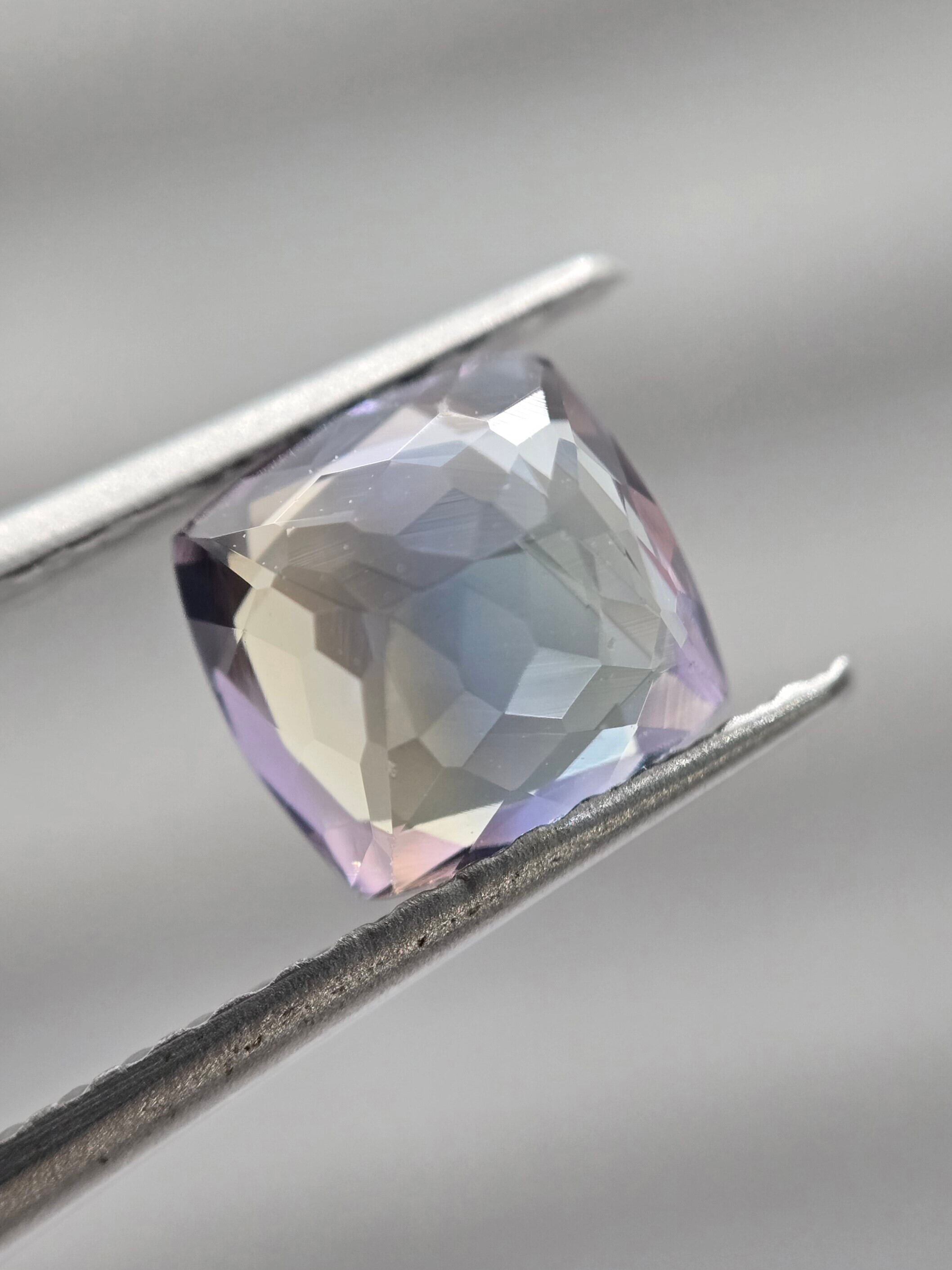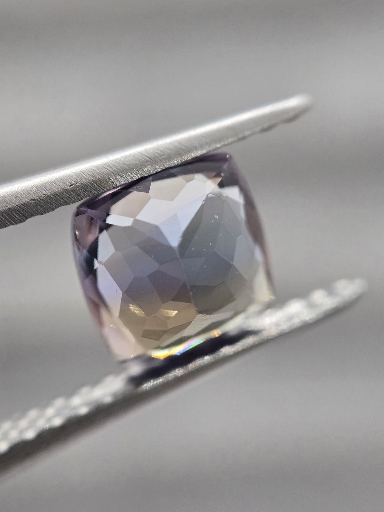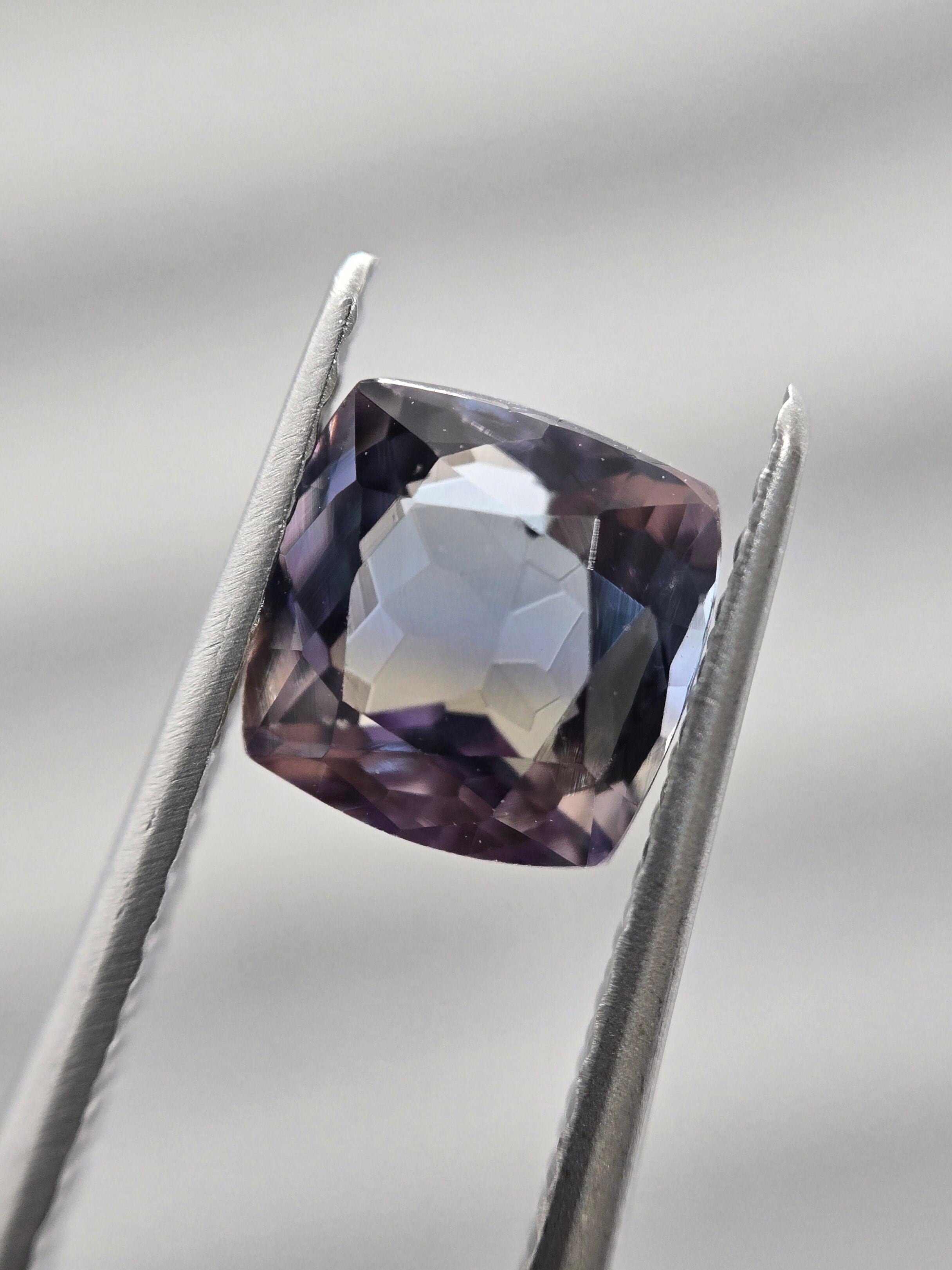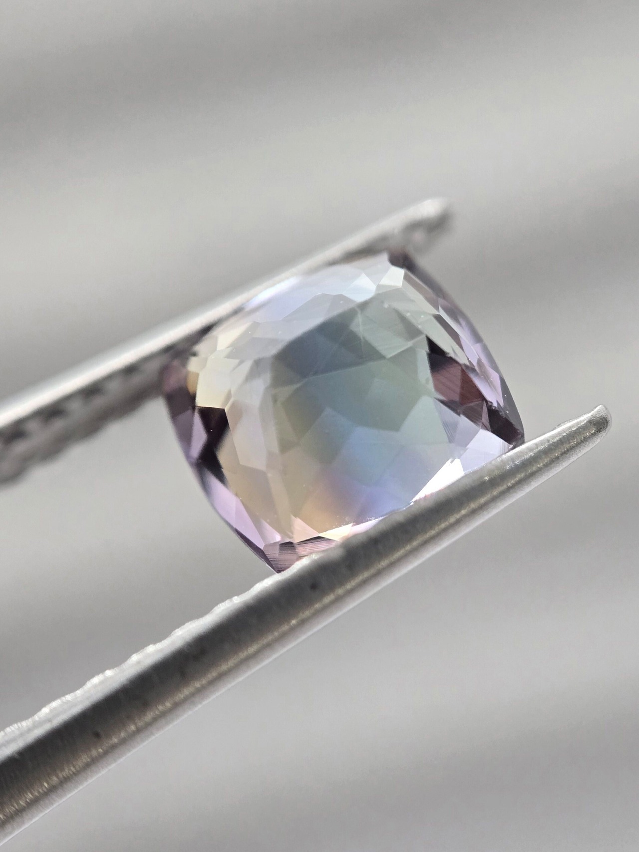 中央に帯状に青色が入り、それを挟んで褐色と薄めのパープルが見えるトリカラーのようなゾイサイトです。